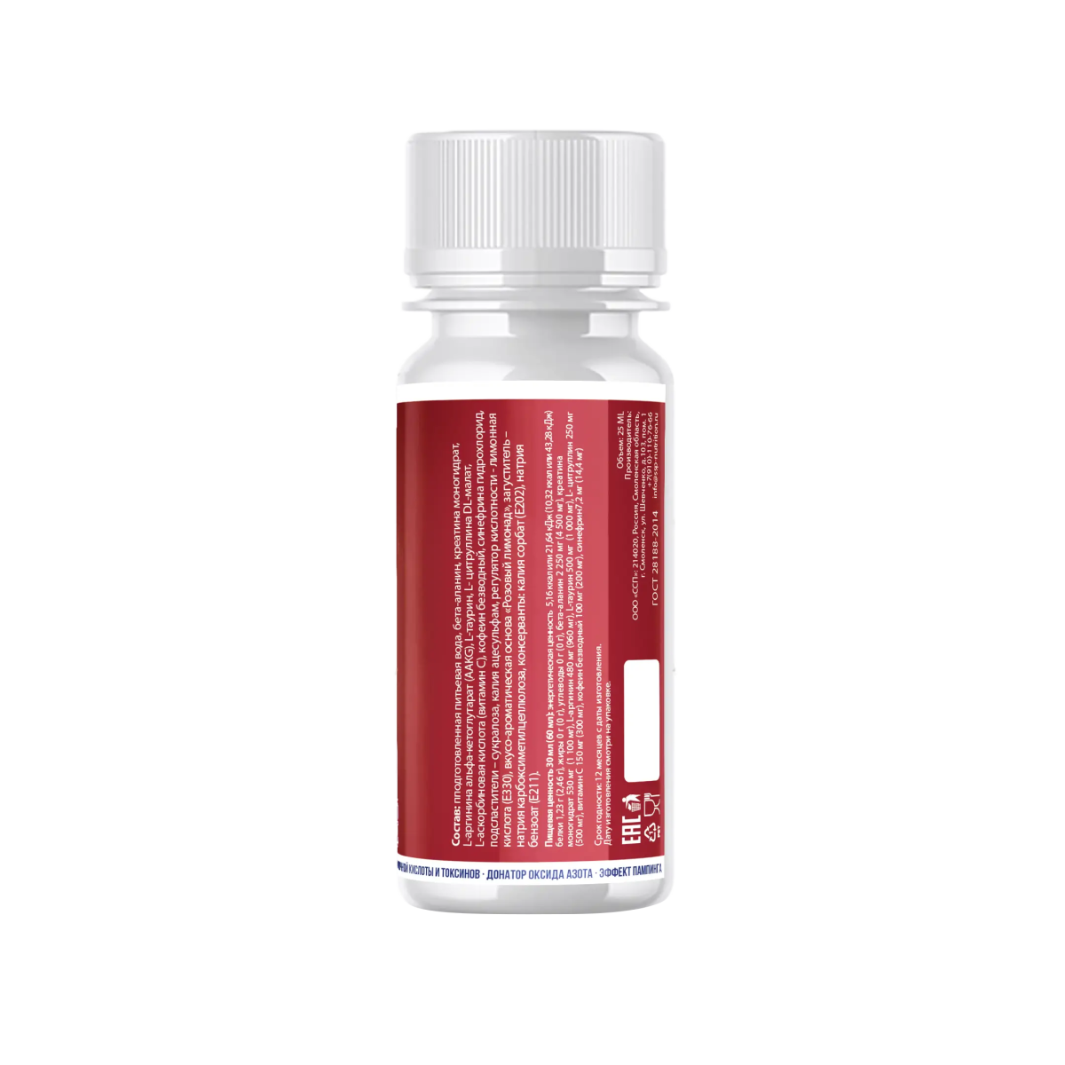 Состав: подготовленная питьевая вода, бета-аланин, креатина моногидрат, альфа-кетоглутарат (AAkG), L- цитруллина, аскорбиновая кислота (витамин С), кофеин безводный, синефрина гидрохлорид, подсластители - сукралоза, калия ацесульфам, регулятор кислотности - лимонная кислота (ЕЗЗО), вкусо-адаатическая хнова «Розовый лимонад», загуститель - натрия карбоксиметилцеллюлоза, консерванты: калия сорбат (Е202), натрия бензоат (Е211). Пищевая ценность 30 мл белки 1,23 г (2,46 г) жиры 0 г (0 г) углеводы 0 г (0 г) бета-аланин 2 250 мг (4 500 мг), креатина моногидрат 530 мг (1 100 мг), Л-аргинин 480 мг, Л-таурин 500 мг (1 000мг), Л- цитруллин 250 мг витакмн С 150 мг, Кофеин безводный 100 мг (200 мг), синефрин 7,2 мг
