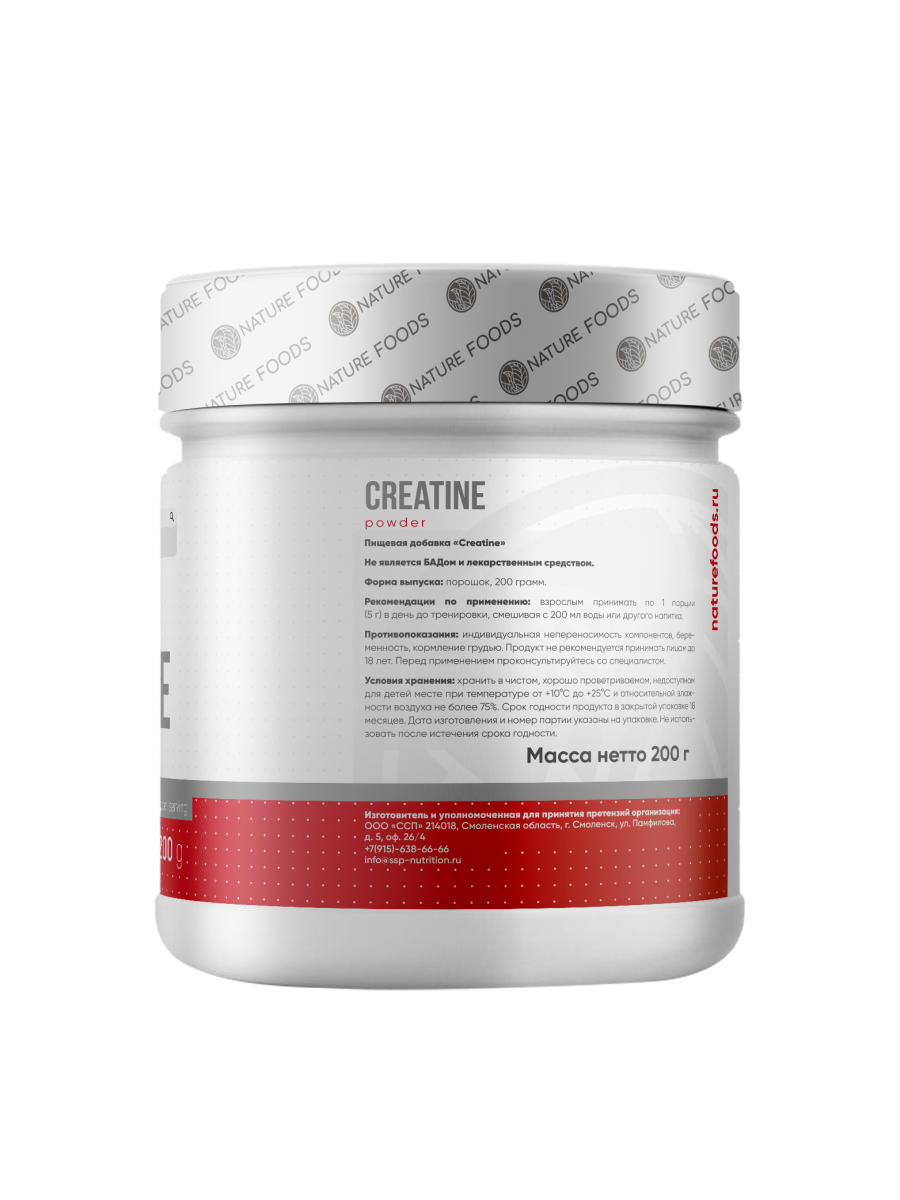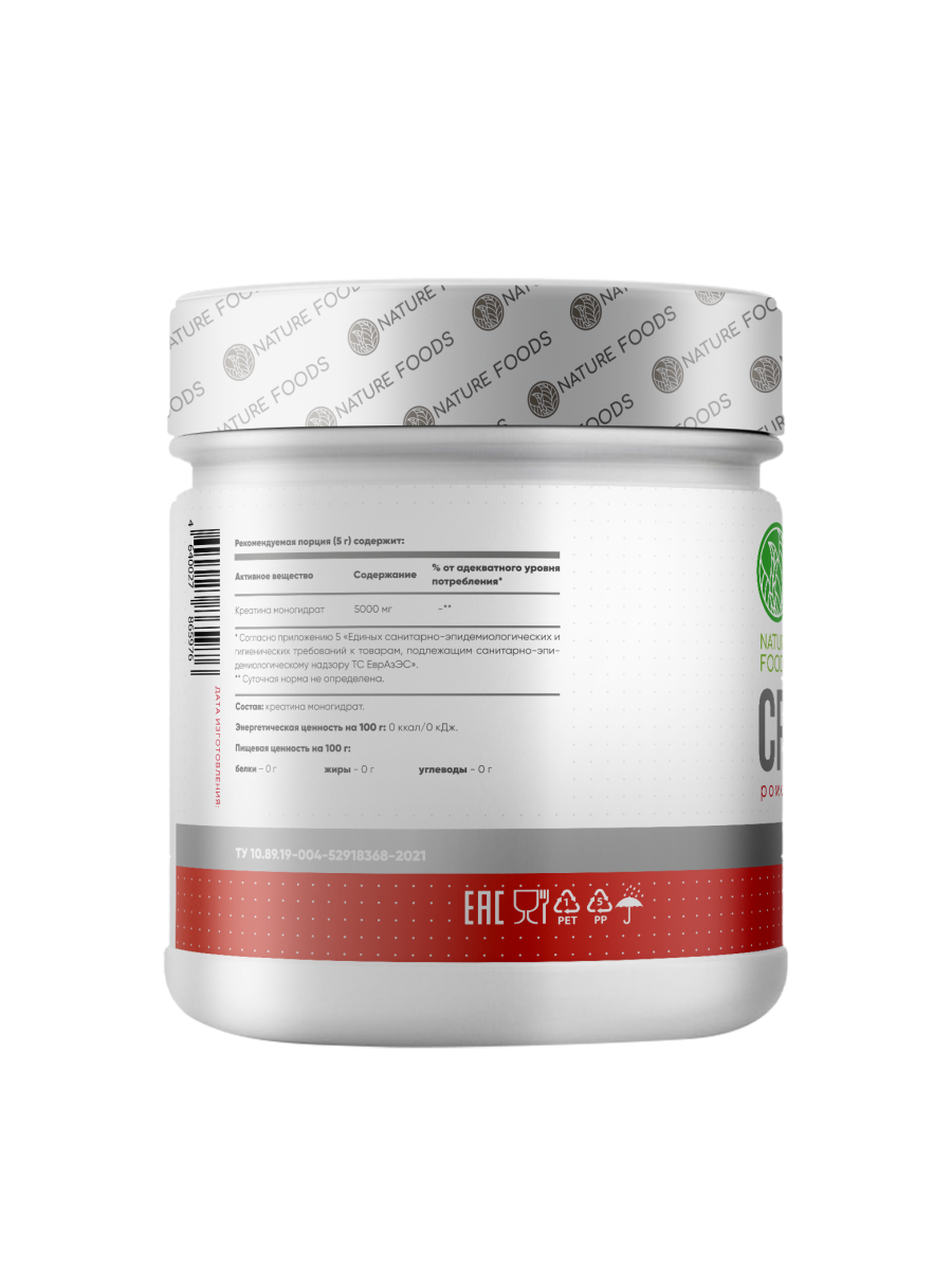 Nature Foods Creatine – это основной источник энергии для организма при выполнении высокоинтенсивной нагрузки. Креатин является энергетическим субстратом для производства АТФ, когда мышцы подвергаются силовой или скоростно-силовой работе. При наборе мышечной массы рост силовых показателей является одним из главных условий. Креатин моногидрат не только увеличивает силовые показатели на 15-20%, но и накапливает жидкость внутри самой мышцы, благодаря чему она визуально становится больше. Так же этот эффект помогает смягчить травмирующее воздействие тяжелых весов на мышцы и суставы. Креатин моногидрат является самой популярной и биодоступной формой для большинства занимающихся. Его регулярное использование дает видимый прогресс как в восстановлении, так и в прогрессии силовых результатов. Размер порции: 5 грамм (1 мерная ложка) Количество порций: 40 Состав на одну порцию: Креатин моногидрат – 5000 мг Рекомендации по приму: Принимать одну порцию (1 мерная ложка) утром после еды и одну порцию за 30-60 минут до тренировки. В день отдыха – одну порцию после завтрака и одну порцию после ужина.