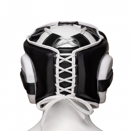 Шлем для бокса мексиканского стиля в черно-белой расцветке. В этом шлеме мы постарались предусмотреть всё, что необходимо профессиональному спортсмену, для проведения тренировочных спаррингов. Традиционно начали с качественных материалов. Внешняя часть выполнена из высококачественной 100% натуральной кожи, для долговечности и комфорта. Внутренняя поверхность отделана «искусственной замшей» со средний уровнем ворсистости, обеспечивающей не только комфортные ощущения для кожи лица и не допускающей проскальзывания, но и обладающей превосходными терморегулирующими и влагоотводящими свойствами. В плане безопасности мы предусмотрели следующие аспекты: - утолщенная лобная часть для максимальной защиты и снижения ударной нагрузки; - специально подобранный комбинированный многослойный пенный наполнитель с повышенными ударопоглощающими свойствами; - утолщения в области носа, для максимальной защиты носа, позволяют значительно снизить травматичность; - увеличенные «щечки», прикрывающие скулы, максимизируют защитный эффект; - защита ушей с перегородками; - усиленная защита затылка. Подгонка по размеры осуществляется на затылке и в верхней части шлема. Конструкция шлема обеспечивает прекрасную обзорность. Шлем имеет низкий вес и очень удобно сидит на голове. Тренировочный шлем для бокса Leaders прекрасно комбинируется с другими элементами экипировки в фирменных расцветках