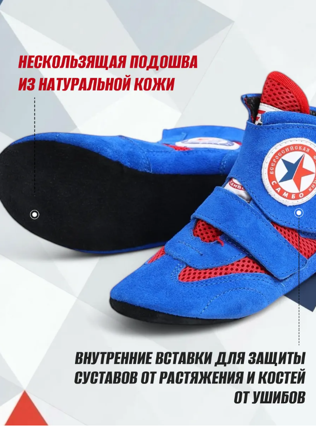 Борцовки для самбо на липучке – это неотъемлемый элемент экипировки для каждого, кто увлекается этим видом спорта. Наши самбовки созданы с учетом всех требований, предъявляемых к обуви для борьбы, бокса и других единоборств. Подошва выполнена из натуральной кожи с внутренней стелькой из полиуретана. Самбовки произведены по колодке и держат форму. Они обеспечивают идеальную фиксацию ног, защиту и комфорт, помогая спортсмену достигать наилучших результатов на ринге или татами. Особенности наших борцовок: - Липучки обеспечивают надежную фиксацию обуви на ноге, позволяя полностью контролировать движения. Липучки помогают подогнать обувь по ноге, обеспечивая максимальный комфорт. - Борцовки изготовлены из прочных и дышащих материалов с использованием сеточки и мягкой подкладки, что обеспечивает вентиляцию и комфорт даже во время интенсивных тренировок. Подошва выполнена из специального материала, который обеспечивает отличное сцепление с поверхностью, предотвращая скольжение и снижая риск травм. - Мягкая стелька и подкладка защищают ноги от ударов и натираний, обеспечивая комфорт в течение всей тренировки. Борцовки идеально подходят как для взрослых мужчин и женщин, так и для подростков и детей. - Мы предлагаем широкий выбор цветов – от классических красных и синих до стильных белых и черных. Наши борцовки соответствуют традициям российского самбо и добавят вашему образу на тренировках и соревнованиях нотку патриотизма и профессионализма. - Борцовки подходят для занятий самбо и других видов единоборств (дзюдо, бокс, рукопашный бой). Могут использоваться как спортивная обувь для тренировок в зале. - В ассортименте имеются размеры для мужчин, женщин, подростков и детей. Будь то начинающий спортсмен или опытный мастер, каждый найдет подходящую модель. Борцовки станут отличным выбором для ежедневных тренировок, соревнований или как часть спортивной формы. Наши самбовки – это выбор настоящих борцов. Они сочетают в себе высокое качество, комфорт и долговечность.