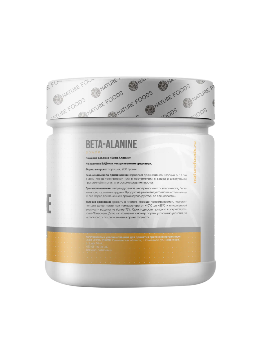 Nature Foods Beta Alanine – это особая форма аминокислоты аланина. Вместе с гистидином образует в мышцах специальный пептид – карнозин. Бета-аланин в составе карнозина выступает в виде буфера молочной кислоты. Он блокирует ее чрезмерное образование, тем самым снижая порог закисляемости в мышцах. При этом увеличивается время до отказа работающей мышцы, повышается работоспособность и выносливость. Прием бета-аланина особенно актуален в тех видах физической активности, где используется средняя интенсивность, в анаэробном режиме с большим образованием молочной кислоты. Идеально подходит для видов спорта со скоростно-силовой выносливостью. Бета-аланин хорошо сочетается с креатином, поэтому одновременный микс этих добавок способен существенно поднять результативность и эффективность тренинга. Размер порции: 5 грамм (1 мерная ложка) Количество порций: 40 Состав на одну порцию: Бета-аланин – 5000 мг Рекомендации по приему: Смешать одну порцию (1 мерная ложка) с 200-300 мл воды и принять за 20-30 минут до тренировки.