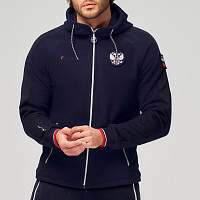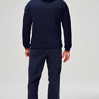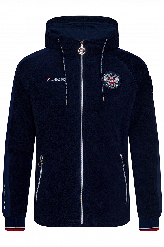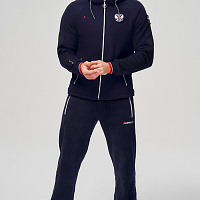 Куртка прямого силуэта с капюшоном. Полочка с центральной застежкой на тесьму молнию. Боковые карманы прорезные обработаны с тесьмой молнией. Капюшон регулируется по высоте с помощью шнурка. Рукава покроя реглан.На рукавах декоративные вставки из ламинированного флиса. Манжеты выполнены из трикотажного полотна ластик. Низ изделия регулируется при помощи эластичного шнура и фиксаторов. Нанесения на куртке: Жаккардовый шеврон «Герб РФ», жаккардовый шеврон«Флаг РФ», вышивка «FORWARD», принт «Мы вместе . Спорт». Брюки слегка зауженного к низу силуэта. Боковые карманы прорезные, застегиваются на молнию. Вдоль боковых швов декоративныевставки из ламинированного флиса. Пояс с эластичной тесьмой. Ширина пояса регулируется шнуром, вставленным внутрь. Ширина по низу регулируется при помощи эластичного шнура и фиксаторов. Нанесения на брюках: вышивка «FORWARD». Состав: ткань верха 100% полиэстер 240г/м², флис с двусторонним подчесом.
