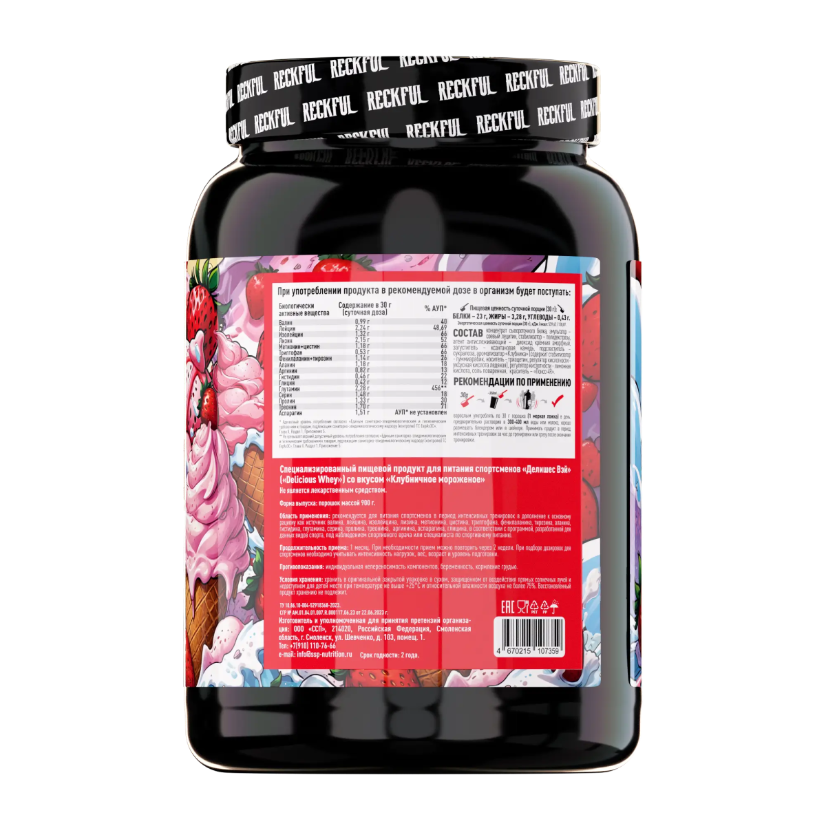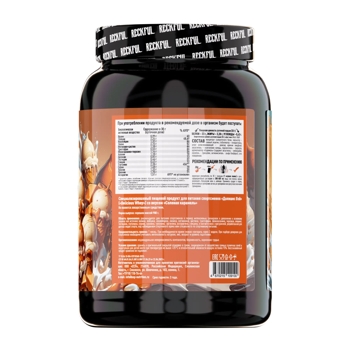 Reckful ® Whey + Polydextrose – белковый комплекс для энергии, силы и восстановления Reckful ® Whey + Polydextrose – это сочетание высококачественного сывороточного белка и полидекстрозы, обеспечивающее мощную поддержку мышечного роста, восстановления и энергии. Формула содержит быстро усваиваемый белок для эффективного питания мышц и полидекстрозу – полезный пребиотический углевод, поддерживающий пищеварение и обеспечивающий длительное насыщение. Преимущества Reckful ® Whey + Polydextrose: – Полноценный белковый комплекс для набора сухой мышечной массы и восстановления – Пребиотическая поддержка благодаря полидекстрозе, способствующей здоровью кишечника – Быстрое усвоение без тяжести и дискомфорта в желудке – Разнообразие вкусов, которые делают каждую порцию настоящим удовольствием Аппетитные вкусы Reckful ® Whey + Polydextrose: – Blueberry Ice Cream – нежное черничное мороженое с натуральной ягодной сладостью и сливочной текстурой – Chocolate Ice Cream – насыщенный вкус шоколадного мороженого с бархатистым, глубоко-какао послевкусием – Cinnabon – уютный аромат свежей корицы с карамельно-сливочной ноткой воздушной сдобы – Salted Caramel – баланс сладости и легкой солености в мягкой карамели с кремовым послевкусием – Strawberry Ice Cream – вкус спелой клубники, дополненный легкой сливочной ноткой, как в настоящем мороженом Как принимать: смешайте 1 порцию (30 г) с 200-300 мл воды или молока. Принимайте после тренировки, утром или в любое время дня для поддержания белкового баланса.