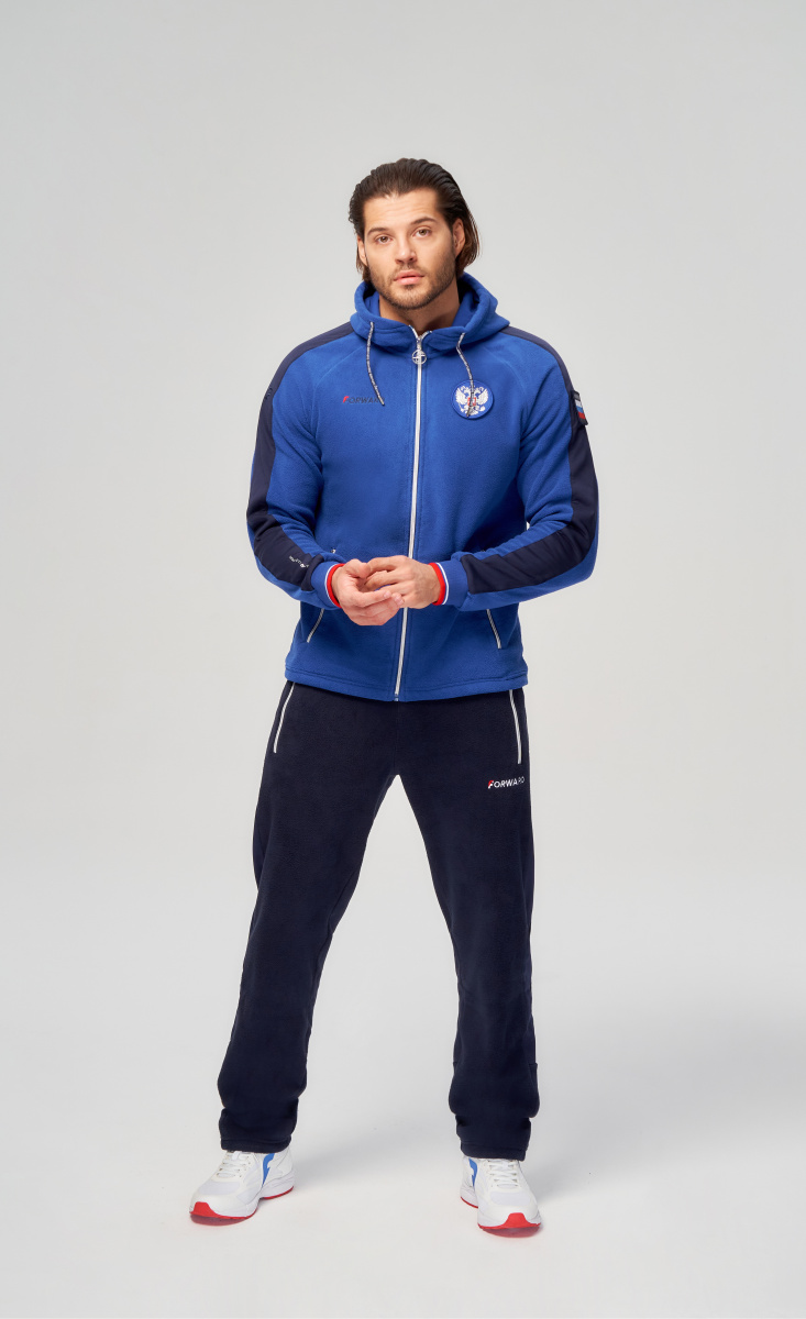 Куртка прямого силуэта с капюшоном. Полочка с центральной застежкой на тесьму молнию. Боковые карманы прорезные обработаны с тесьмой молнией. Капюшон регулируется по высоте с помощью шнурка. Рукава покроя реглан.На рукавах декоративные вставки из ламинированного флиса. Манжеты выполнены из трикотажного полотна ластик. Низ изделия регулируется при помощи эластичного шнура и фиксаторов. Нанесения на куртке: Жаккардовый шеврон «Герб РФ», жаккардовый шеврон«Флаг РФ+RUSSIAN NATIONAL TEAM», вышивка «FORWARD», вышивка «RUSSIA», принт «WINNER». Брюки слегка зауженного к низу силуэта. Боковые карманы прорезные, застегиваются на молнию. Вдоль боковых швов декоративныевставки из ламинированного флиса. Пояс с эластичной тесьмой. Ширина пояса регулируется шнуром, вставленным внутрь. Ширина по низу регулируется при помощи эластичного шнура и фиксаторов. Нанесения на брюках: вышивка «FORWARD», вышивка «RUS». Состав: ткань верха 100% полиэстер 240г/м², флис с двусторонним подчесом.