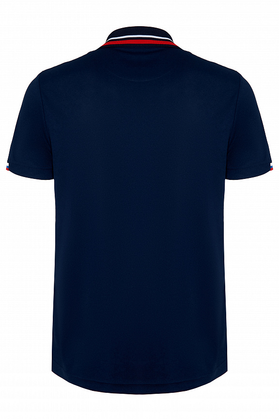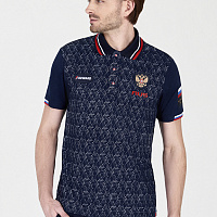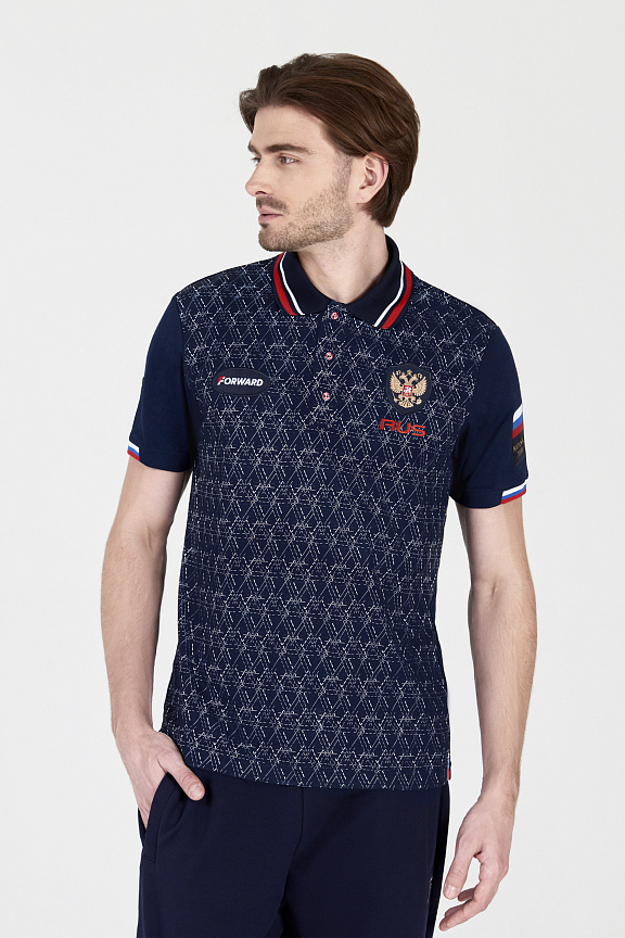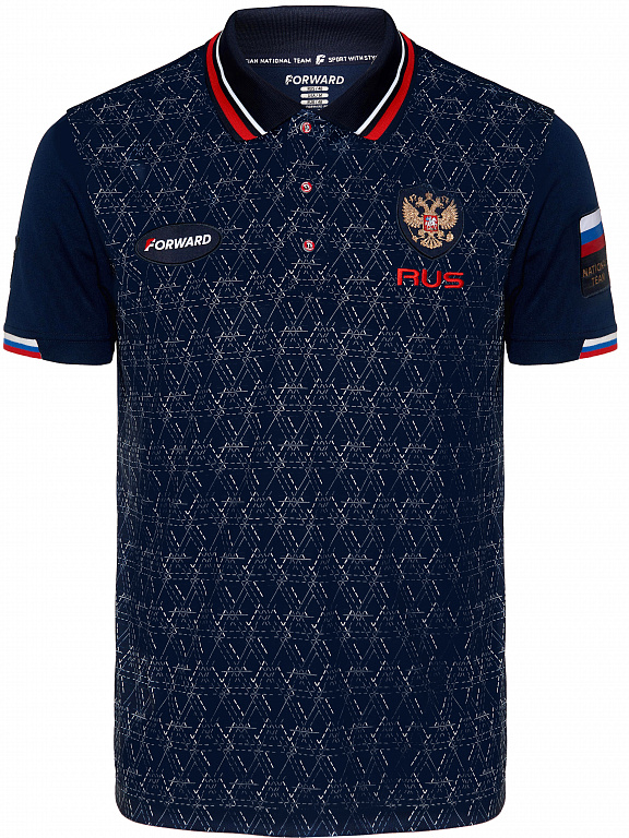 Рубашка Поло выполнена из трикотажного полотна пике, прямого силуэта. Полочка с застежкой планкой на три пуговицы. Рукава втачные. В боковых швах по низу выполнены разрезы. Воротник и вставки по низу рукавов выполнены из трикотажного полотна ластик. С изнаночной стороны спинки обтачка, настроченная на спинку. Нанесения: Жаккардовый шеврон «Герб РФ», жаккардовый шеврон «Флаг РФ, NATIONAL TEAM», вышивка «RUS», вышивка «FORWARD», 3D вышивка «F», декоративный принт. Состав: 100% хлопок, 200г/м2.
