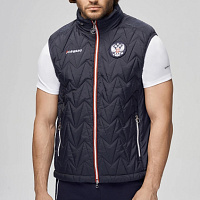 Жилет прямого силуэта с капюшоном. Воротник стойка имеет карман для капюшона с застежкой на молнию. Капюшон регулируется эластичным шнуром со стопперами, убирается в воротник. Полочка с центральной застежкой на тесьму молнию. Боковые карманы обработаны в рельефных швах с тесьмой молнией. Детали полочек и спинки выполнены с отрезными бочками, формирующими силуэт изделия. Проймы окантованы эластичной тесьмой. Жилет на флисовой подкладке. Низ изделия регулируется по объему с помощью эластичного шнура с фиксаторами. Нанесения: Жаккардовый шеврон «Герб РФ», вышивка «FORWARD», принт «Мы вместе.Спорт». Состав: ткань верха 100% полиэстер подкладка флис 100% полиэстер 180г/м2, утеплитель 100% полиэстер.