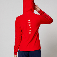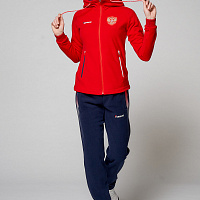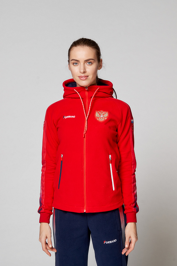 Куртка полуприлегающего силуэта с капюшоном. Полочка с центральной застежкой на тесьму молнию. Боковые карманы прорезные обработаны с тесьмой молнией. Капюшон регулируется по высоте с помощью шнурка. Рукава комбинированного покроя. Вставки рукавов, выполнены из ткани компаньона. Манжеты выполнены из трикотажного полотна ластик. Низ изделия регулируется при помощи эластичного шнура и фиксаторов. Нанесения на куртке: Жаккардовый шеврон «Герб РФ», шеврон «Флаг РФ+NATIONAL TEAM», вышивка «FORWARD», 3D вышивка «F», аппликативная вышивка «RUSSIA», фирменный принт. Брюки слегка зауженного к низу силуэта, с боковыми вставками из полотна компаньона. Боковые карманы, застегиваются на молнию. Пояс с эластичной тесьмой. Ширина пояса регулируется шнуром, вставленным внутрь. Ширина по низу регулируется при помощи эластичного шнура и фиксаторов. Нанесения на брюках: вышивка «FORWARD», фирменный принт. Состав: ткань верха 100% полиэстер 240г/м², флис с двусторонним подчесом, 100% полиэстер 240г/м², флис с ламинацией.