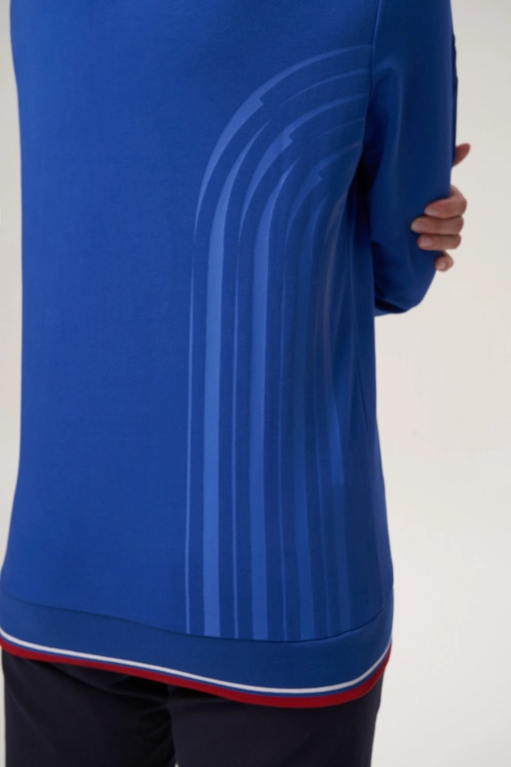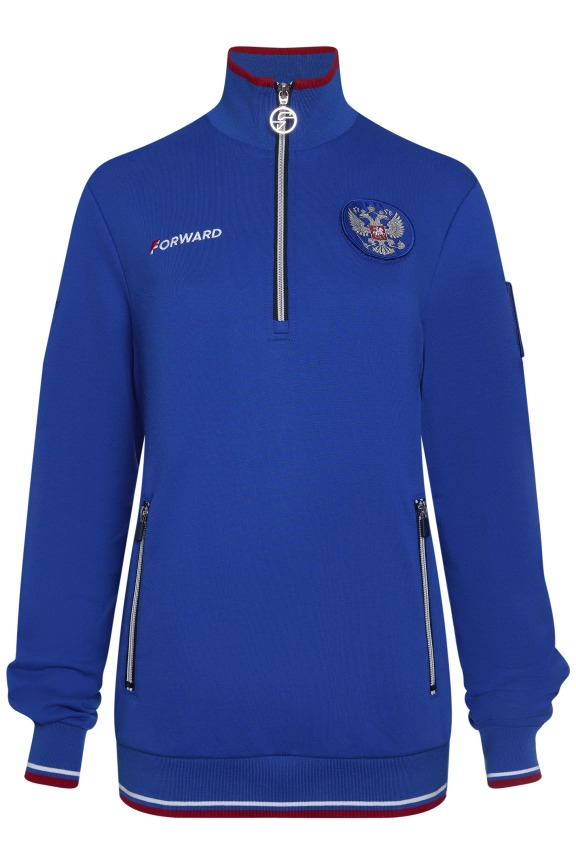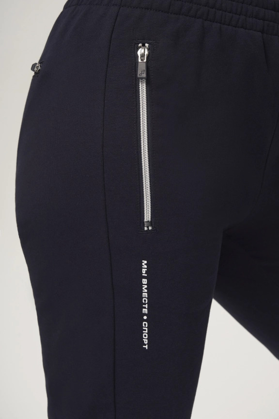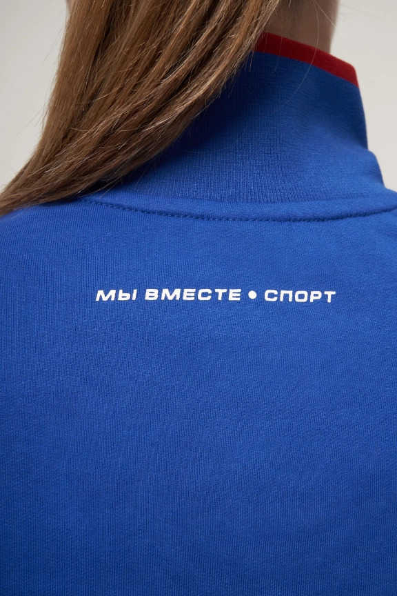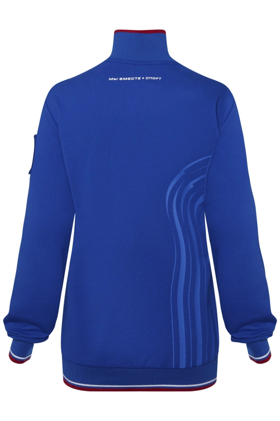 Куртка прямого силуэта. Полочка с центральной застежкой на тесьму молнию до уровня груди, с воротником стойка. Боковые крманы прорезные с входами на тесьме молнии. Рукава втачные. Воротник манжеты рукавов и низ изделия обработаны с трикотажным полотном ластик. Нанесения на куртке: Жаккардовый шеврон «Герб РФ», жаккардовый шеврон «Флаг РФ», вышивка «FORWARD», декоративный принт «Трек», принт «Мы вместе.Спорт». Брюки зауженного силуэта с боковыми, прорезными карманами на тесьму молнию. Пояс с эластичной тесьмой. Ширина пояса регулируется шнуром, вставленным внутрь. Низ брюк выполнен с манжетами из трикотажного полотна ластик. Нанесения брюки: вышивка «FORWARD», вышивка «Мы вместе.Спорт». Состав: 80% хлопок, 20% полиэстер, 290г/м².