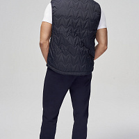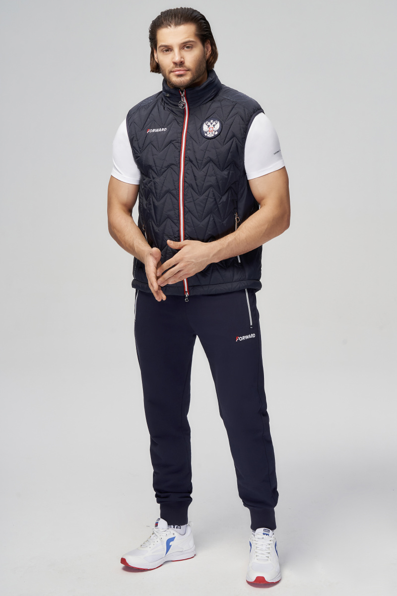 Жилет прямого силуэта с капюшоном. Воротник стойка имеет карман для капюшона с застежкой на молнию. Капюшон регулируется эластичным шнуром со стопперами, убирается в воротник. Полочка с центральной застежкой на тесьму молнию. Боковые карманы обработаны в рельефных швах с тесьмой молнией. Детали полочек и спинки выполнены с отрезными бочками, формирующими силуэт изделия. Проймы окантованы эластичной тесьмой. Жилет на флисовой подкладке. Низ изделия регулируется по объему с помощью эластичного шнура с фиксаторами. Нанесения: Жаккардовый шеврон «Герб РФ» вышивка «FORWARD» принт «Мы вместе. Спорт» Состав: ткань верха 100% полиэстер, подкладка флис 100% полиэстер 180г/м2, утеплитель 100% полиэстер.