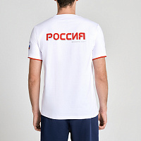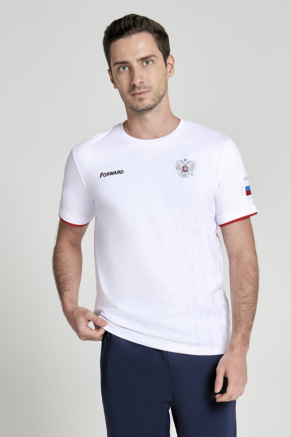 Футболка прямого силуэта с O-образным вырезом горловины. Обтачка горловины выполнена из трикотажного полотна ластик. Рукав втачной с контрастной обтачкой понизу. Нанесения: жаккардовый шеврон «Герб РФ» жаккардовый шеврон «Флаг РФ» принт «РОССИЯ Мы вместе. Спорт» вышивка «FORWARD» 3D вышивка «F» принт «Трек» Состав: 95% хлопок, 5% эластан, 180г/м2.