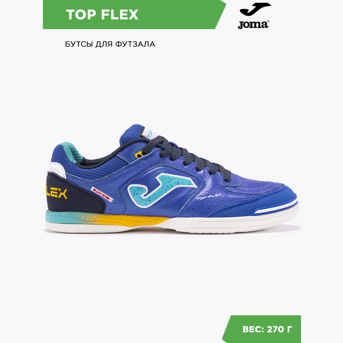 Joma Top Flex – бестселлер испанского бренда. Одни из самых продаваемых футзалок, Top Flex завоевали признание профессионалов благодаря высочайшему качеству материалов, из которых изготовлены. Материалов, определяющих игровые характеристики этой модели: эластичность, контроль мяча, амортизация и долговечность... Joma Top Flex гибкие за счет того, что верхняя их часть изготовлена из натуральной кожи. Идеальная посадка стопы и устойчивость достигается за счет применения системы 360º. Носок и пятка усилены для защиты. За амортизацию отвечает межподошва, выполненная из филона. Для подошвы Joma используют износостойкую резину, обеспечивающую отличный контакт с поверхностью. Интегрированные в рисунок подошвы линии FLEXO добавляют гибкости этим футзалкам.