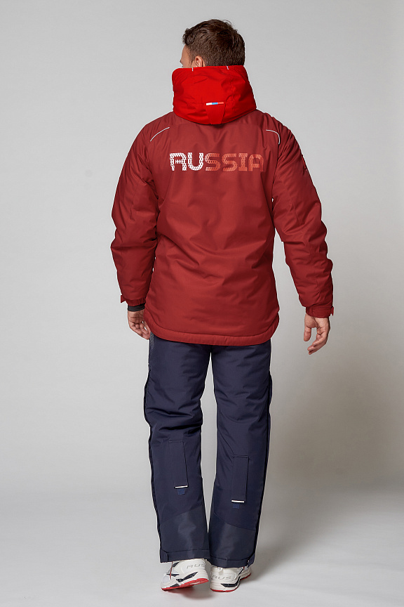 Куртка прямого силуэта с капюшоном, регулируемым по высоте и объему. Полочка с центральной застежкой на тесьму-молнию. В швах проймы и капюшона светоотражающие вставки. Рукава реглан, с внутренними манжетами и патами по низу. Боковые, нагрудный и карман на рукаве застегиваются на тесьму-молнию. Куртка с вентиляцией в области проймы, на тесьму-молнию. Куртка со снегозащитной юбкой. Ширина изделия по низу регулируется при помощи эластичного шнура и фиксаторов. Нанесения на куртке: жаккардовый шеврон «Герб РФ», жаккардовый шеврон «Флаг РФ, NATIONAL TEAM», принт «RUSSIA», вышивка «FORWARD», 3D вышивка «F», декоративный принт, светоотражающие элементы. Температурный режим: от +0°С до -15°С. Брюки прямого силуэта, с отстегивающимися и регулирующимися бретелями. Брюки с боковыми карманами на тесьме-молния. По низу брюк выполнены снегозащитные манжеты. Нанесения на брюках: принт «RUSSIA», вышивка «FORWARD», декоративный принт, светоотражающие элементы. Состав: ткань верха - 100% полиэстер, подкладка - 100% полиэстер, наполнитель - 100% полиэстер.