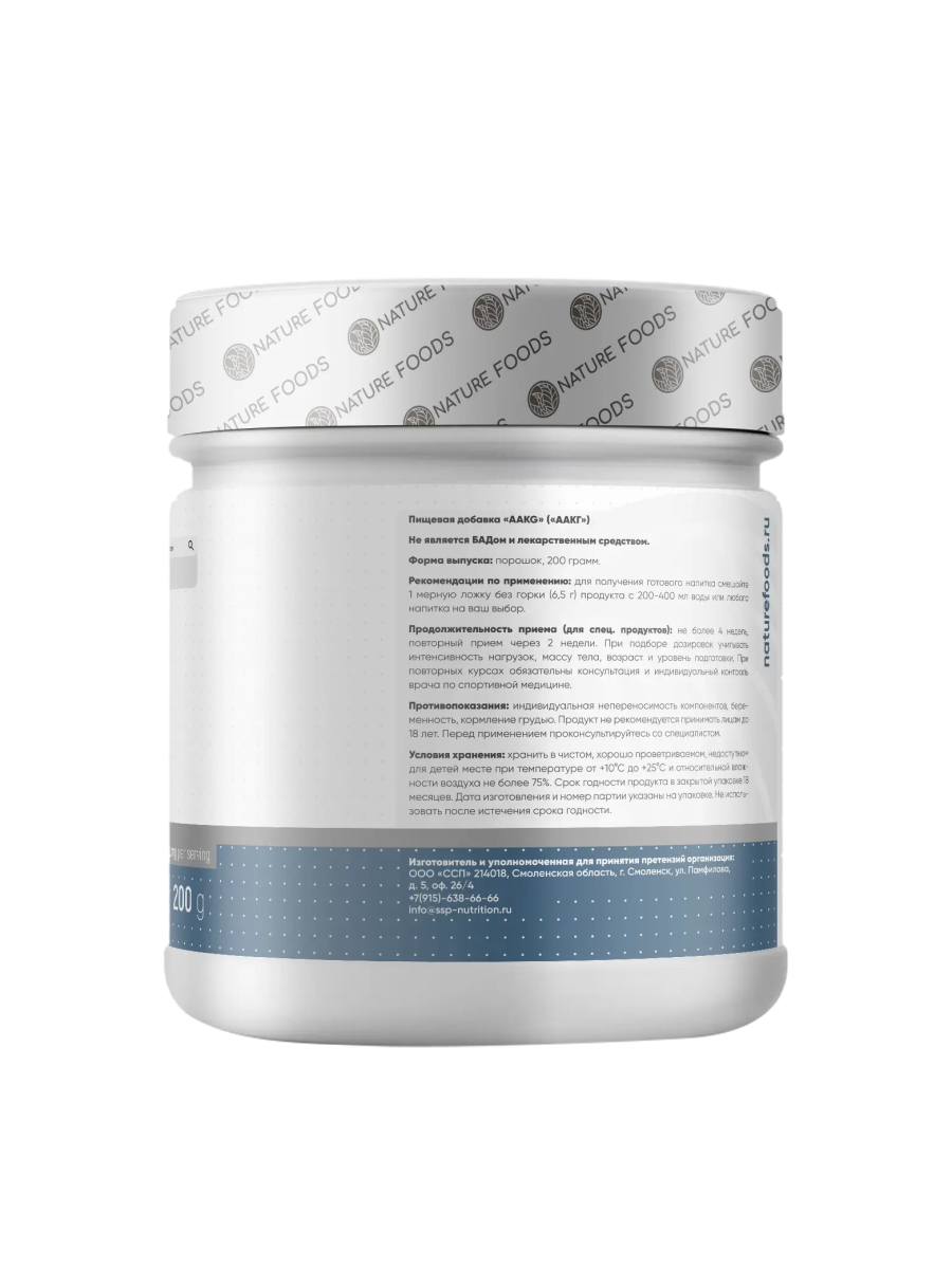 Nature Foods AAKG (аргинин альфа-кетоглутарат) – это специальная форма аминокислоты аргинина. По сравнению со стандартной классической формой аргинина, альфа-кетоглутаровая имеет ряд преимуществ, главные из которых: более высокая биодоступность и пролонгированный эффект. Благодаря высокой биодоступность прием аргинина альфа-кетоглутарата осуществляется в более меньшей дозировке, по сравнению с обычным аргинином, при сохранении того же эффекта. Главный эффект AAKG - стимуляции производства оксида азота в организме, который воздействует на гладкую мускулатуру кровеносных сосудов, расслабляя их. Тем самым усиливается кровоток по организму и кровенаполняемость работающих мышц. Этот эффект обеспечивает активных транспорт кислорода и питательных веществ в мышечную клетку и усиливает вывод продуктов распада из них. Так же AAKG может усиливать секрецию гормона роста, поэтому в некоторых случаях его прием показан перед сном. Размер порции: 6,5 грамм (1 мерная ложка) Количество порций: 30 Состав на одну порцию: L-аргинин альфа-кетоглутарата – 6500 мг Рекомендации по приему: Принимать 6,5 грамм (1 мерная ложка) за 30 минут до тренировки. В не тренировочные дни половину мерной ложки утром и половину - вечером после еды.