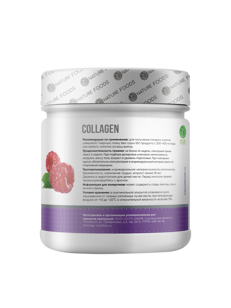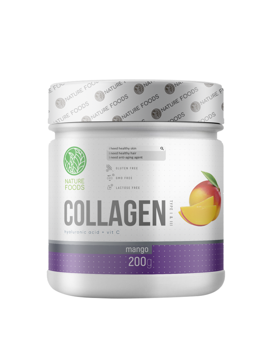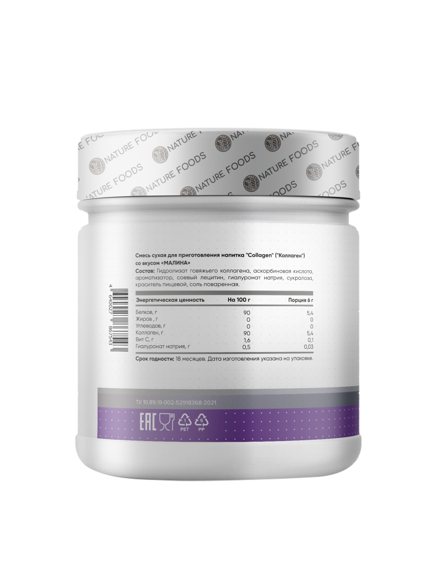Nature Foods Collagen + Hyaluronic acid + Vit C – это гидролизированный коллаген с добавлением витамина С и гиалуроновой кислоты. Имеет высокий уровень усвояемости и биодоступности для организма. Главная функция коллагена – это укрепление костей, связок и сухожилий. Он подходит как для профилактики, так и является вспомогательным продуктом при лечении заболеваний, связанных с нарушением функциональности суставо-связачного аппарата. Так же Nature Foods Collagen + Hyaluronic acid + Vit C положительно влияет на состояние кожи, волос и ногтей, что делает его незаменимым средством для поддержания красоты. Благодаря наличие в составе витамина С, стимулируется образование двух основных коллагеновых аминокислот – гидроксипролина и гидроксилизина. Гиалуроновая кислота входит в состав хрящей, соединительной ткани, синовиальной жидкости, кожи, губ и межклеточного пространства. Она обеспечивает обмен, динамику, накопление и распределение жидкости, благодаря чему эти структуры имеют здоровую упругость, плотность и вязкость. Размер порции: 6 грамм (1 мерная ложка) Количество порций: 33 Состав на одну порцию: Коллаген – 5400 мг Витамин С – 100 мг Гиалуронат натрия – 30 мг Рекомендации по приму: Смешать одну порцию (1 мерная ложка) с 300-500 воды и принимать один раз в день утром после еды.