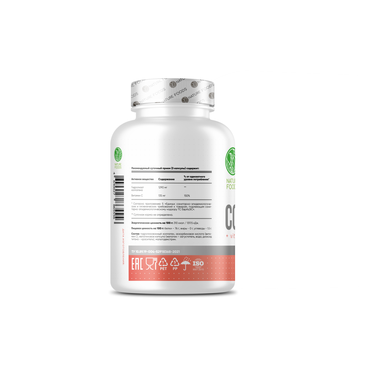Nature Foods Collagen + Vitamin C – гидролизат коллагена улучшает состояние кожи, повышая ее слажность, упругость и эластичность. Также коллаген способствует заживлению ран и других повреждений кожного покрова. Витами С укрепляет имунную систему человека, а также предохраняет ее от вирусов и бактерий, ускоряет процесс заживления ран, оказывает влияение на синтез ряда гормонов и регулярует процессы кроветворения. Размер порции: 1 капсулы Количество порций: 120 Состав на 3 капсулы: Гидролизат коллагена 1290 мг Витамин С – 135 мг Рекомендации по приему: взрослым принимать по 1 капсуле 3 раза в день во время еды.