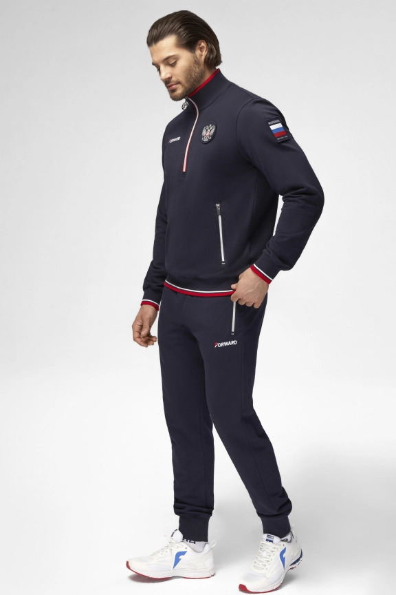 Куртка прямого силуэта. Полочка с центральной застежкой на тесьму молнию до уровня груди, с воротником стойка. Боковые крманы прорезные с входами на тесьме молнии. Рукава втачные. Воротник манжеты рукавов и низ изделия обработаны с трикотажным полотном ластик. Нанесения на куртке: Жаккардовый шеврон «Герб РФ», жаккардовый шеврон «Флаг РФ», вышивка «FORWARD», декоративный принт «Трек», принт «Мы вместе.Спорт». Брюки зауженного силуэта с боковыми, прорезными карманами на тесьму молнию. Пояс с эластичной тесьмой. Ширина пояса регулируется шнуром, вставленным внутрь. Низ брюк выполнен с манжетами из трикотажного полотна ластик. Нанесения брюки: вышивка «FORWARD», вышивка «Мы вместе.Спорт». Состав: 80% хлопок, 20% полиэстер