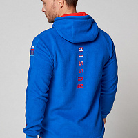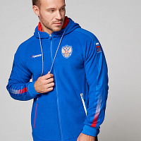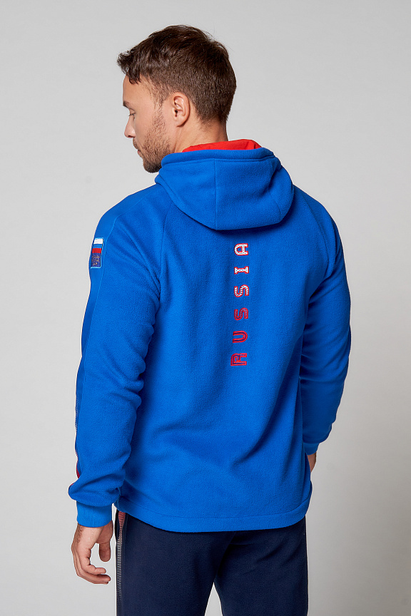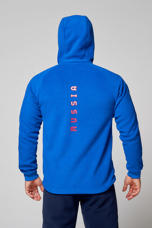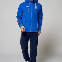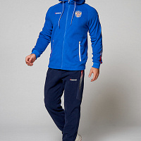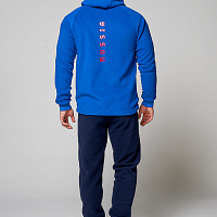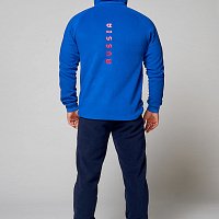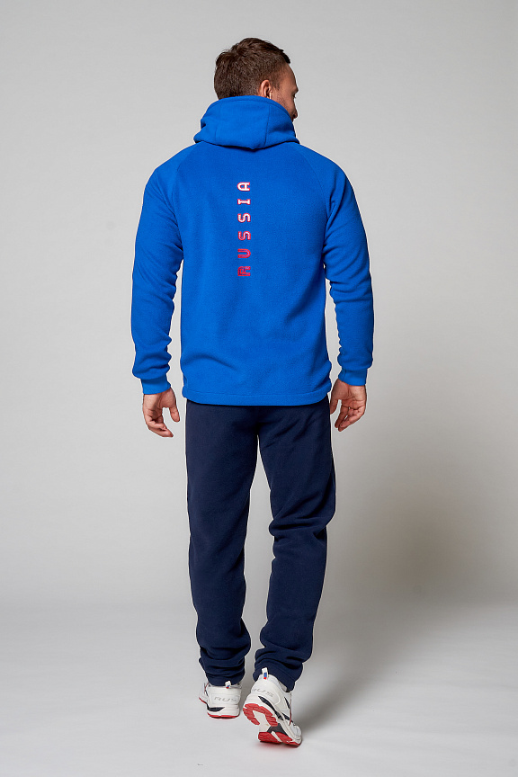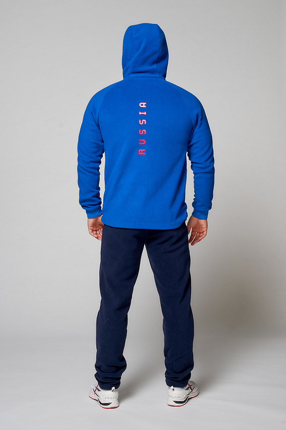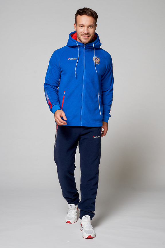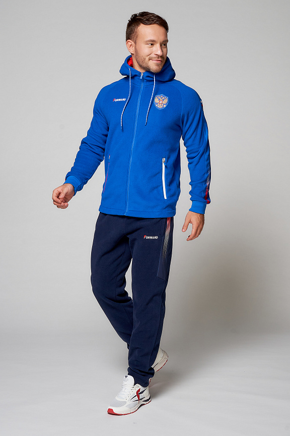 Куртка прямого силуэта с капюшоном. Капюшон регулируется по высоте с помощью шнурка. Рукава комбинированного покроя. Вставки рукавов выполнены из ткани-компаньона. Манжеты выполнены из трикотажного полотна ластик. Низ изделия регулируется при помощи эластичного шнура и фиксаторов. Нанесения на куртке: жаккардовый шеврон «Герб РФ+NATIONAL TEAM», жаккардовый шеврон «Флаг РФ», вышивка «FORWARD», аппликативная вышивка «RUSSIA», фирменный принт. Брюки слегка зауженного к низу силуэта, с боковыми вставками из полотна-компаньона. Боковые карманы застегиваются на молнию. Пояс с эластичной тесьмой. Ширина пояса регулируется шнуром, вставленным внутрь. Ширина по низу регулируется при помощи эластичного шнура и фиксаторов. Нанесения на брюках: вышивка «FORWARD», фирменный принт. Куртка прямого силуэта с капюшоном. Полочка с центральной застежкой на тесьму молнию. Боковые карманы прорезные обработаны с тесьмой молнией. Капюшон регулируется по высоте с помощью шнурка. Рукава покроя реглан. Вставки рукавов, выполнены из ткани компаньона. Манжеты выполнены из трикотажного полотна ластик. Низ изделия регулируется при помощи эластичного шнура и фиксаторов. Нанесения на куртке: Жаккардовый шеврон «Герб РФ», жаккардовый шеврон «Флаг РФ+NATIONAL TEAM», вышивка «FORWARD», 3D вышивка «F», аппликативная вышивка «RUSSIA», фирменный принт. Брюки слегка зауженного к низу силуэта, с боковыми вставками из полотна компаньона. Боковые карманы, застегиваются на молнию. Пояс с эластичной тесьмой. Ширина пояса регулируется шнуром, вставленным внутрь. Ширина по низу регулируется при помощи эластичного шнура и фиксаторов. Нанесения на брюках: вышивка «FORWARD», фирменный принт. Состав: ткань верха 100% полиэстер 240г/м², флис с двусторонним подчесом, 100% полиэстер 240г/м², флис с ламинацией.