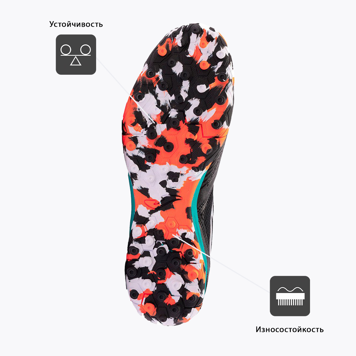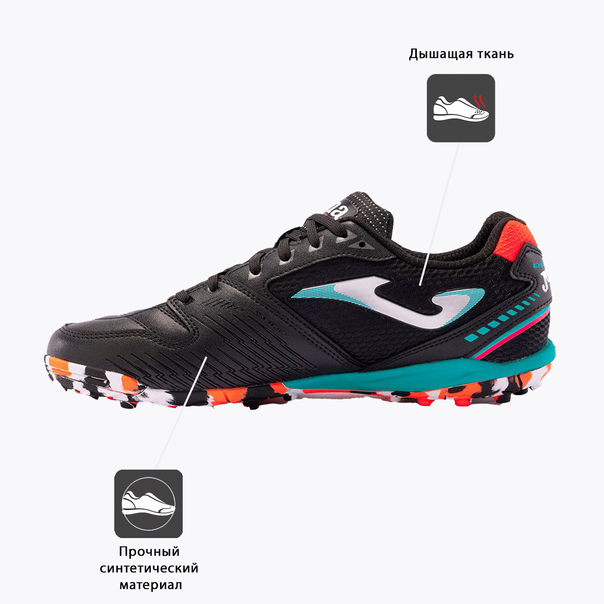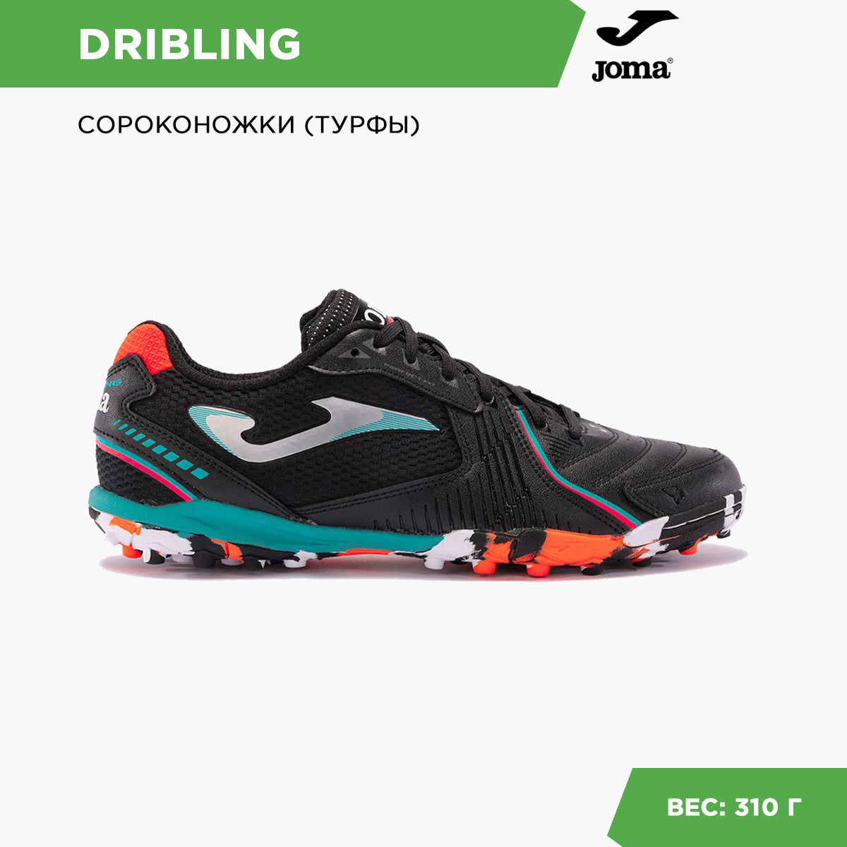 Турфы (сороконожки) Joma DRIBLING предназначены для игры на полях с искусственным покрытием. Отличительные характеристики — устойчивость, вентиляция и износостойкость — результат точного сочетания материалов, в том числе и сетчатого, применяемых в этой модели. Воздухообмен улучшает дополнительная перфорация (технология VTS), которая позволяет отводить излишнюю влагу и тепло и сохранять комфортные ощущения в течение всего времени тренировки или игры. Благодаря технологии шнуровки PERFECT FIT в DRIBLING улучшена посадка, а усиленная передняя часть защищает стопу. Износостойкая резиновая подошва, где применены технологии DURABILITY, FLEXO и ROTATION, обеспечивает необходимый уровень устойчивости, амортизации и позволяет футболисту быстро менять направление движения. DURABILITY – технология, применяемая в изготовлении подошвы из прочной и износостойкой резины определенной плотности, измеряемой в DIN. Защищает стопу и увеличивает срок службы обуви. Воздухопроницаемость (обувь) VTS – система, которая обеспечивает воздухопроницаемость материала, из которого изготовлена верхняя часть кроссовок, и сохраняет комфортную температуру стопы атлета во время бега. Технология предполагает наличие отверстий в материале, расположенных в тех зонах, которые более всего нуждаются в этом. VTS помогает избежать появления влаги, предотвращает образования бактерий. FLEXO – система линий сгиба на подошве, способствующая наилучшему переходу от пятки к носку при беге. Технология позволяет кроссовкам сгибаться в соответствии с естественными движениям стопы спортсмена. PROTECTION Дополнительный слой ткани большей плотности в местах наиболее подверженных износу. ROTATION Геометрическая фигура (точка вращения) на подошве облегчающая резкие развороты и изменения направления движения игрока, а также предохраняющая от травм коленей и лодыжек. Резина Тип: Вспененный полимер Плотность: 700 гр/м2