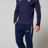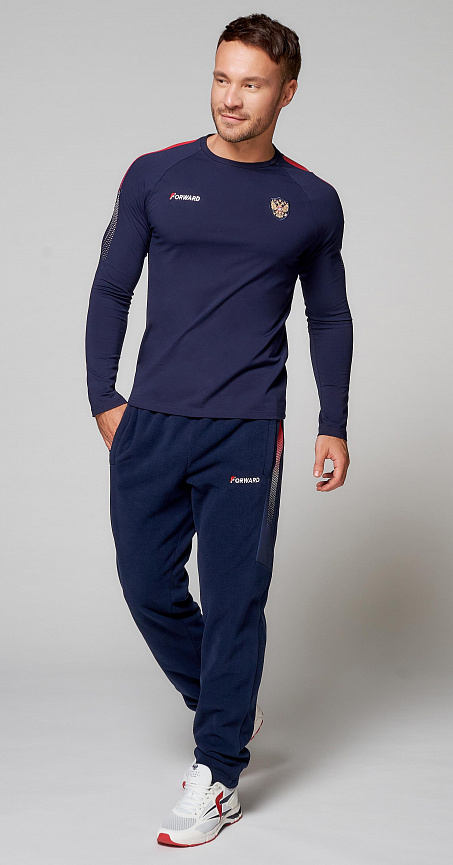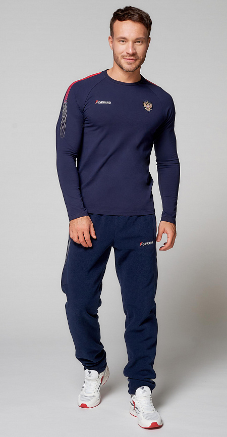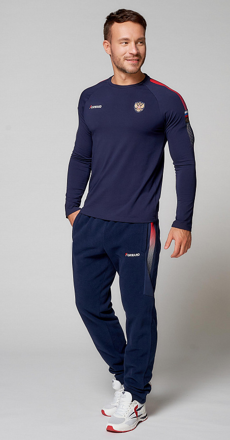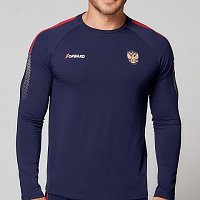 Футболка прямого силуэта с О-образным вырезом горловины. Обтачка горловины выполнена из трикотажного полотна. Рукав покроя Реглан. Нанесения: Жаккардовый шеврон «Герб РФ», жаккардовый шеврон «Флаг РФ, NATIONAL TEAM», принт «RUSSIA», вышивка «FORWARD», 3D вышивка «F», декоративный принт. Состав: 95%хлопок, 5%эластан, 180г/м2.
