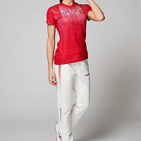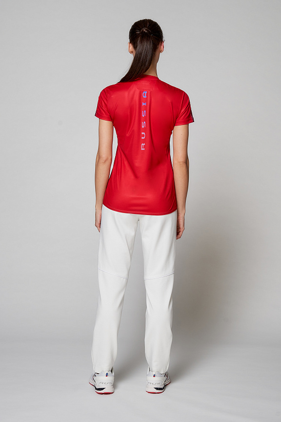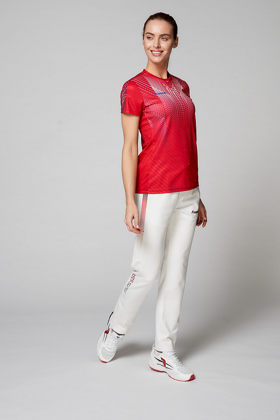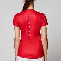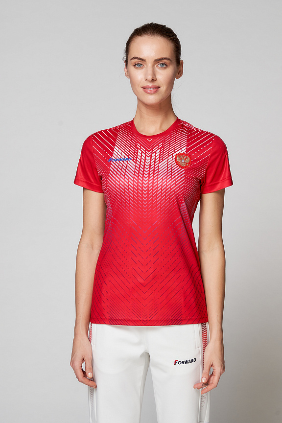 Футболка полуприлегающего силуэта с О-образным вырезом горловины. Обтачка горловины выполнена из основного полотна. Рукав втачной. Полочка запринтованая. Боковые вставки выполнены из сетчатого полотна. Нанесения: Жаккардовый шеврон «Герб РФ», жаккардовый шеврон «Флаг РФ, NATIONAL TEAM», принт «RUSSIA», вышивка «FORWARD», 3D вышивка «F», декоративный принт. Состав: 100% полиэстер, 135-145г/м2.