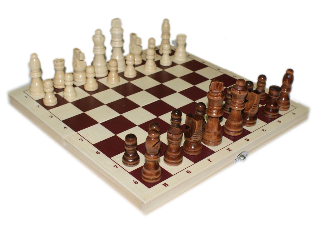 Фигуры бежевого и коричневого цвета, выполнены из дерева, основание покрыто коричневым бархатом. Доска складная выполнена из дерева (не лакированая), по периметру игрового поля нанесена шахматная нотация. Внутри доски место для хранения фигур, снаружи железная защелка, предотвращающая случайное открытие доски.