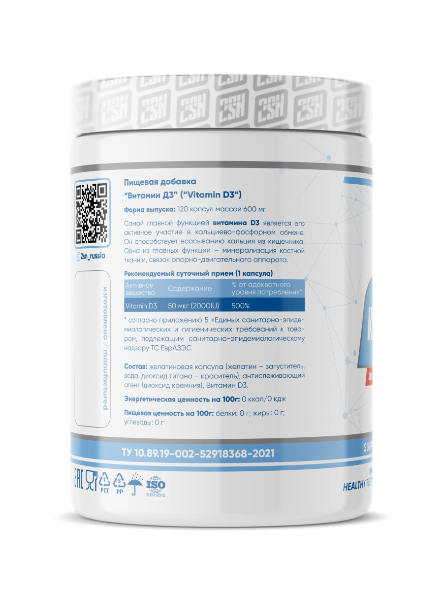 2SN Vitamin D3 2000IU – это витамин D3 (холекальцеферол), один из жирорастворимых, поступление в организм которого является жизненно важным для человека. Витамин D3 выполняют главную роль в усвоении кальция и фосфора всеми тканями организма. Особенно это важно для крепости костей и зубов. Витамин D3 обеспечивает стабильную работу наших иммунных клеток - лимфоцитов, которые противодействуют распространению вирусов и бактерий. Так же витамин D3 предотвращает развитие аутоиммунных заболеваний и онкологий. 2SN Vitamin D3 2000IU находится в удобной капсулированной форме, что положительно сказывается на биодоступности, а также имеет невысокую концентрацию на капсулу, что позволяет его удобно дозировать, в зависимости от массы тела. Размер порции: 1 капсула Количество порций: 120 Состав на одну порцию: Витамин D3 (холекальциферол) – 2000 МЕ (50 мкг) Состав: желатиновая капсула (желатин-загуститель, вода, диоксид титана-краситель), антислеживающий агент (диоксид кремния), Витамин D3. Рекомендации по приему: Принимать одну порцию (1 капсула) 1-2 раза в день после еды, в зависимости от массы тела и рациона питания. Противопоказания: индвидуальная непереносимость компонентов, беременность, кормление грудью. Продукт не рекомендуется принимать лицам до 18 лет. Перед применением проконсультируйтесь со специалистом. Срок годности: 24 месяца.