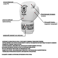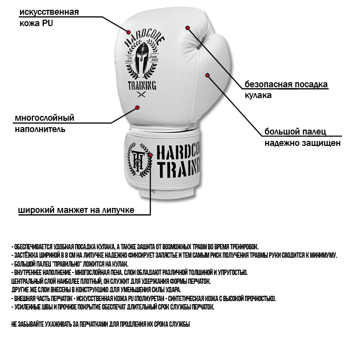 Боксерские перчатки Hardcore Training Helmet PU. Перчатки для бокса, которые подойдут и новичку, и опытному любителю, и тёртым калачам. Обеспечивается удобная посадка кулака, а также защита от возможных травм во время тренировок. Застёжка шириной в 8 см на липучке надежно фиксирует запястье и тем самым риск получения травмы руки сводится к минимуму. Большой палец "правильно" ложится на кулак. Внутреннее наполнение - многослойная пена. Слои обладают различной толщиной и упругостью - центральный слой наиболее плотный, он служит для удержания формы перчаток. Другие же слои внесены в конструкцию для уменьшения силы удара. Внешняя часть перчаток - искусственная кожа PU (полиуретан - синтетическая кожа с высокой прочностью). Усиленные швы и прочное покрытие обеспечат длительный срок службы перчаток. Подходят для тренировок по боксу, мма, тайскому боксу. Не забывайте ухаживать за перчатками для продления их срока службы. Условная таблица размеров боксёрских перчаток: Размер Ваш вес 10 Oz 45-60 12 Oz 60-75 14 Oz 75-90 16 Oz 90 и более Таблица условная. Она не учитывает силы и скорости удара спортсмена.
