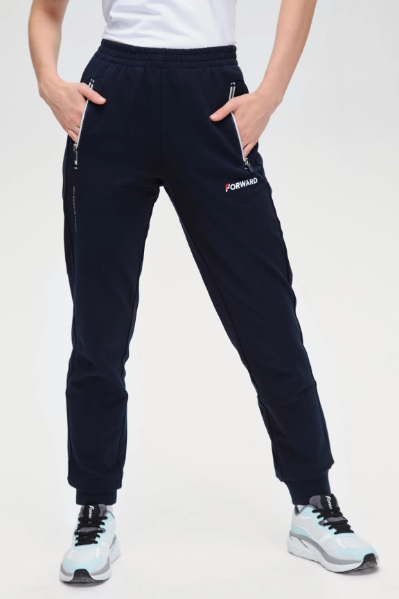 Куртка прямого силуэта. Полочка с центральной застежкой на тесьму молнию, с воротником стойка. Боковые крманы прорезные с входами на тесьме молнии. Рукава втачные. Воротник манжеты рукавов и низ изделия обработаны с трикотажным полотном ластик. Нанесения на куртке: Жаккардовый шеврон «Герб РФ», жаккардовый шеврон «Флаг РФ», вышивка «FORWARD», декоративный принт «Трек», принт «Мы вместе.Спорт». Брюки зауженного силуэта с боковыми, прорезными карманами на тесьму молнию. Пояс с эластичной тесьмой. Ширина пояса регулируется шнуром, вставленным внутрь. Низ брюк выполнен с манжетами из трикотажного полотна ластик. Нанесения брюки: вышивка «FORWARD», вышивка «Мы вместе.Спорт». Состав: 80% хлопок, 20% полиэстер