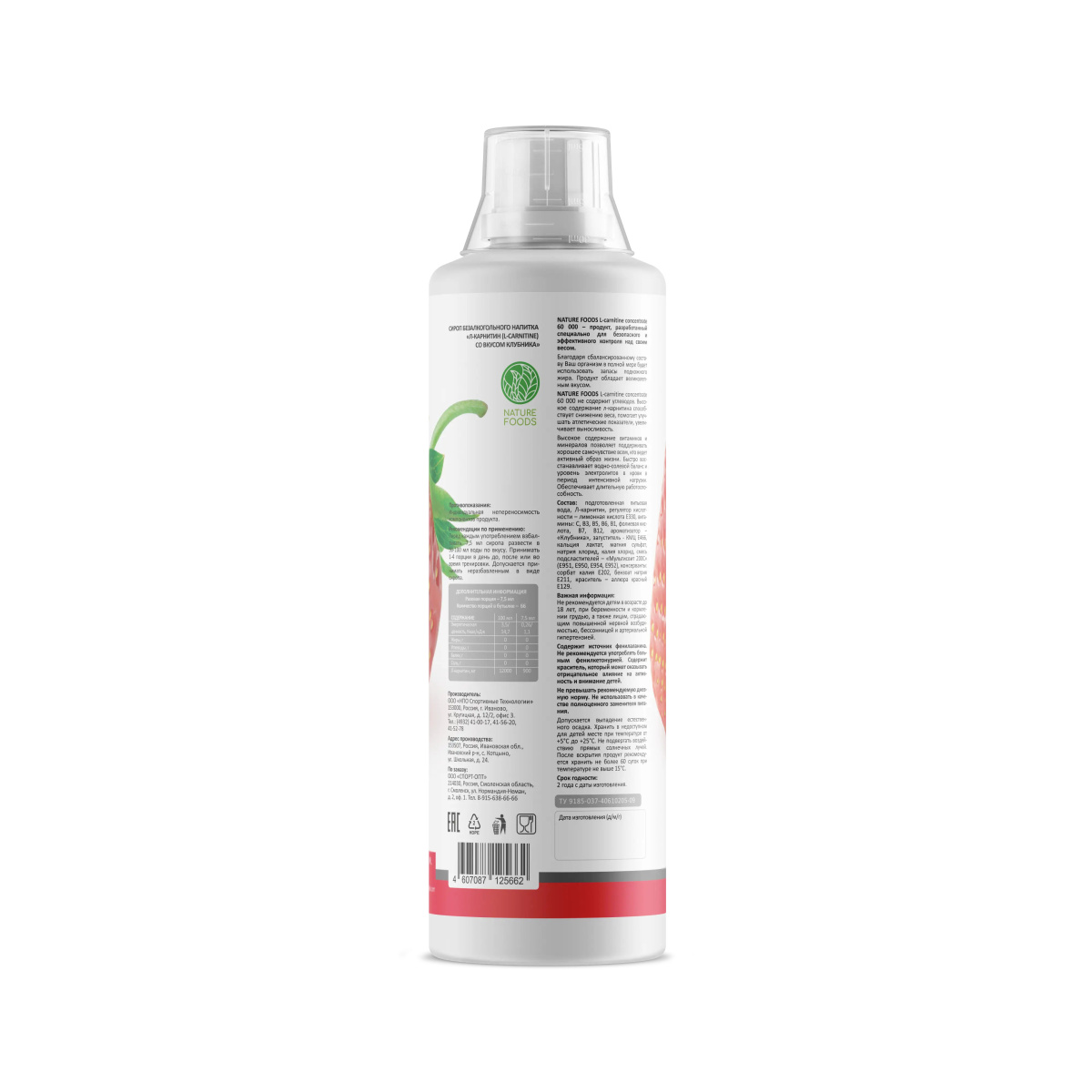 Nature Foods L-carnitine concentrate 60.000 – это чистый концентрат л-карнитин в жидкой форме. Л-карнитин выполняет транспортную функцию, то есть переносит жирные кислоты в митохондрии в мышечной (и не только) клетке, где они превращаются в энергию. Таким образом л-карнитин стимулирует процесс жиросжигания. Так же л-карнитин служит важным субстратом для повышения выносливости, поэтому его использование крайне актуально во многих видах спорта, где превалирует это физическое качество. Прием л-карнитина заметно улучшает поддержку сердечно-сосудистой системы, защищая миокард от энергетического голода и снижая уровень холестерина, избыток которого может пагубно отразиться на работе сосудов. Nature Foods L-carnitine concentrate имеет высокую степень биодоступности благодаря жидкой форме, его прием будет удобен как во время выполнения нагрузки, так и до нее. Для повышения эффективности в жиросжигании л-карнитин необходимо использовать ежедневно. Размер порции: 7,5 мл (отметка на мерном колпачке) Количество порций: 66 Состав на одну порцию: Калорий – 0 Жиры – 0 г Углеводы – 0 г Белки – 0 г Л-карнитин – 900 мг Рекомендации по приму: Принимать 1-4 порции (7,5 - 30 мл) в первой половине дня перед тренировкой или физической активностью, в зависимости от массы тела, интенсивности нагрузки и задач.