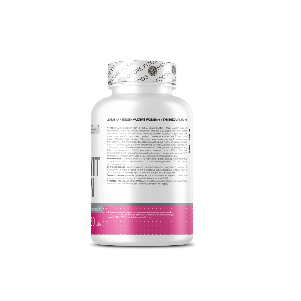 Nature Foods Multi WoMen – это витаминно-минеральный комплекс для улучшения состояния женского здоровья. Имеет невысокие концентрации компонентов, поэтому может быть использован не только спортсменами, но и людьми ведущих малоподвижный образ жизни. Обеспечивает укрепление и защиту всех органов и систем организма. Налаживает обмен веществ и работу иммунитета. Оказывает восстанавливающее действия для кожи, волос и ногтей. Оказывает профилактическое действие на женскую репродуктивную систему. Дополняет рацион питания при различных ограничивающих диетах. Регулирует водно-солевой баланс, что помогает избавиться от лишней жидкости в организме. Помогает быстрее адаптировать организм при занятиях физическими упражнениям и их меняющейся интенсивности. Идеально сочетается с другими добавками спортивного питания. Имеет высокую биологическую доступность всех компонентов. Хорошо переносится, не оказывая дискомфорт для желудочно-кишечного тракта. Размер порции: 1 таблетка Количество порций: 60 Состав на одну порцию: Витамин А – 1,06 мг Витамин С – 75 мг Витамин D3 – 12,5 мкг Витамин Е – 35 мг Витамин К1 – 50 мкг Витамин В1 – 1,1 мг Витамин В2 – 1,1 мг Витамин В6 – 2 мг Витамин В12 – 6 мг Ниацин (витамин РР) – 14 мг Фолиевая кислота – 400 мкг Биотин – 40 мкг Пантотеновая кислота – 15 мг Магний – 100 мг Цинк – 8 мг Кремний – 2 мг Фосфор – 20 мг Кальций – 220 мг Калий – 80 мг Йод – 150 мкг Селен – 18 мкг Медь – 0,5 мг Марганец – 1,8 мг Хром – 32 мкг Молибден – 50 мкг Ванадий – 10 мкг Железо – 18 мг Рекомендации по приему: Принимать одну таблетку в день после завтрака. Можно увеличить дневную дозировку в зависимость от массы тела, рациона питания и задач.