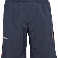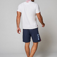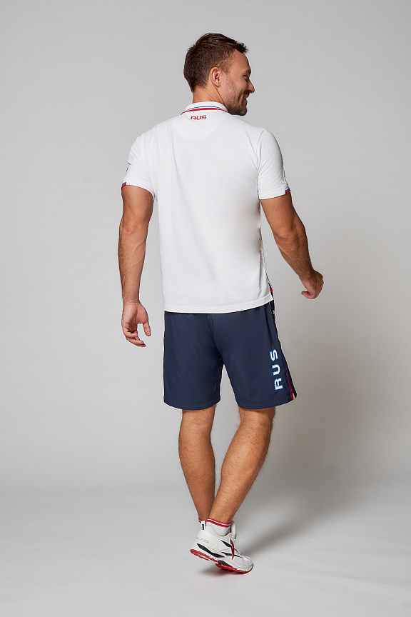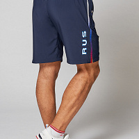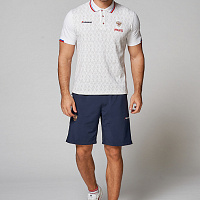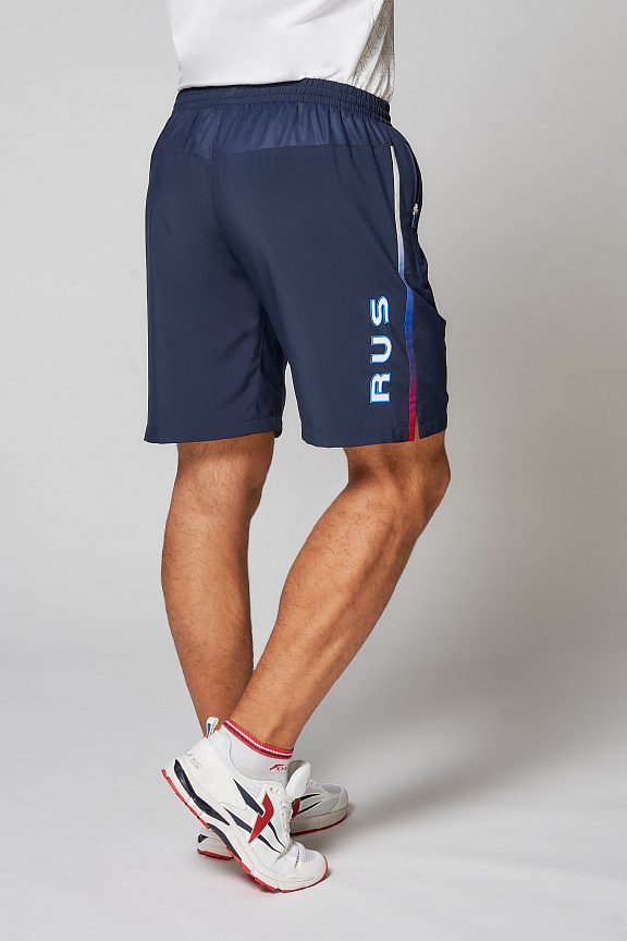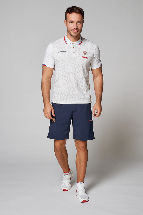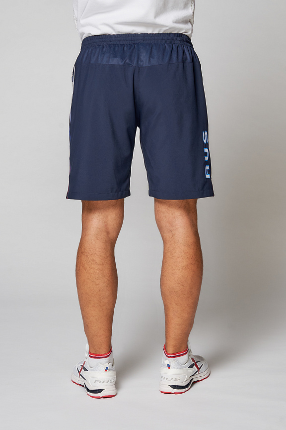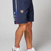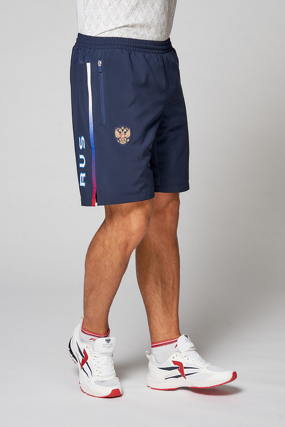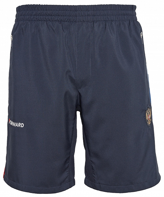 Шорты прямого силуэта без застежки, на подкладке из сетчатого трикотажного полотна. Пояс с эластичной тесьмой. Ширина пояса регулируется шнуром, вложенным внутрь. По боковым швам вставки из запринтованной ткани. На задних половиках шорт кокетка из трикотажного сетчатого материала. Так же сетчатые вставки выполнены по шаговым швам. Боковые карманы с тесьмой молнией. Нанесения: Жаккардовый шеврон «Герб РФ», аппликативная вышивка «RUS», вышивка «FORWARD», декоративный принт. Состав: ткань верха 100% полиэстер, 90-95г/м2, ткань отделки 100% полиэстер, сетка, 135г/м2, подкладка 100% полиэстер, сетка, 80г/м2.