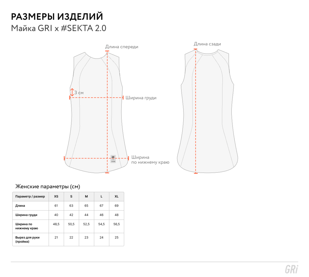 Подойдёт для фитнеса, йоги и других тренировок при температуре от +10° до +30°C. Майка сшита из дышащей ткани с влагоотводящей пропиткой. У этой модели приталенный крой. Разработано вместе с Олей Маркес, основательницей Школы онлайн-фитнеса #sekta. Григорий Лазарев, основатель бренда GRI: «Мы много работали над майка GRI x #SEKTA. Поменяли ткань, улучшили крой изделия. Получилась абсолютно новая модель! Приталенная и в то же время комфортная».. Состав 90% полиэстер, 10% спандекс.