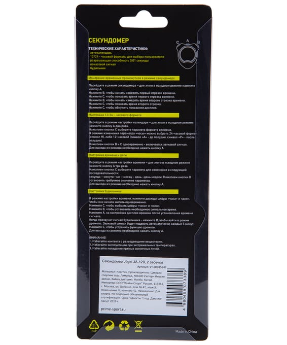 Электронный секундомер Jögel предназначен для измерения времени (результата) спортсмена на тренировках и соревнованиях по различным видам спорта. Модель имеет все необходимые функции. Допустимая погрешность измерения: 0,6 сек. В комплекте идет удобный прочный шнурок для крепления на шее и инструкция по эксплуатации. Секундомер поставляется с батарейкой. Преимущества: Измерение в минутах, секундах и сотых долях секунд; Память на 2 результата; Время и дата в формате 12/24 ч; Будильник; Почасовой сигнал; Не сбрасывается установленная дата после выключения. Характеристики: Материал: пластик Цвет: черный Комплектация: секундомер, шнурок, инструкция Вес, г: 55 Тип упаковки: блистер