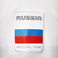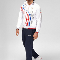 Куртка прямого силуэта на подкладке из сетки. Воротник стойка, внутреняя сторона из трикотажного полотна ластик. Полочка с центральной застежкой молнией. На полочках прорезные боковые карманы на молнии. Рукава покроя Реглан с отрезными манжетами из трикотажного полотна ластик. Низ изделия с поясом из трикотажного полотна ластик. Нанесения на куртке: Жаккардовый шеврон «Герб РФ», жаккардовый шеврон «Флаг РФ», принт «РОССИЯ, Мы Вместе. Спорт», принт «FORWARD», декоративный принт «Трек». Брюки слегка заужены. Боковые карманы в контсруктиных швах на тесьме молнии. Вдоль боковых швов декоративный принт. Пояс с эластичной тесьмой. Ширина пояса регулируется шнуром, вложенным внутрь. В боковых швах, по низу брюк выполнены разрезы с тесьмой молнией. Нанесения брюки: вышивка «FORWARD». Состав: ткань верха 100% полиэстер 250г/м², подкладка сетка: 100% полиэстер.