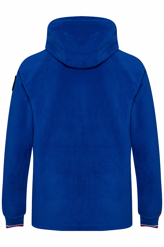 Куртка прямого силуэта с капюшоном. Полочка с центральной застежкой на тесьму молнию. Боковые карманы прорезные обработаны с тесьмой молнией. Капюшон регулируется по высоте с помощью шнурка. Рукава покроя реглан.На рукавах декоративные вставки из ламинированного флиса. Манжеты выполнены из трикотажного полотна ластик. Низ изделия регулируется при помощи эластичного шнура и фиксаторов. Нанесения на куртке: Жаккардовый шеврон «Герб РФ», жаккардовый шеврон«Флаг РФ+RUSSIAN NATIONAL TEAM», вышивка «FORWARD», вышивка «RUSSIA», принт «WINNER». Брюки слегка зауженного к низу силуэта. Боковые карманы прорезные, застегиваются на молнию. Вдоль боковых швов декоративныевставки из ламинированного флиса. Пояс с эластичной тесьмой. Ширина пояса регулируется шнуром, вставленным внутрь. Ширина по низу регулируется при помощи эластичного шнура и фиксаторов. Нанесения на брюках: вышивка «FORWARD», вышивка «RUS». Состав: ткань верха 100% полиэстер 240г/м², флис с двусторонним подчесом.