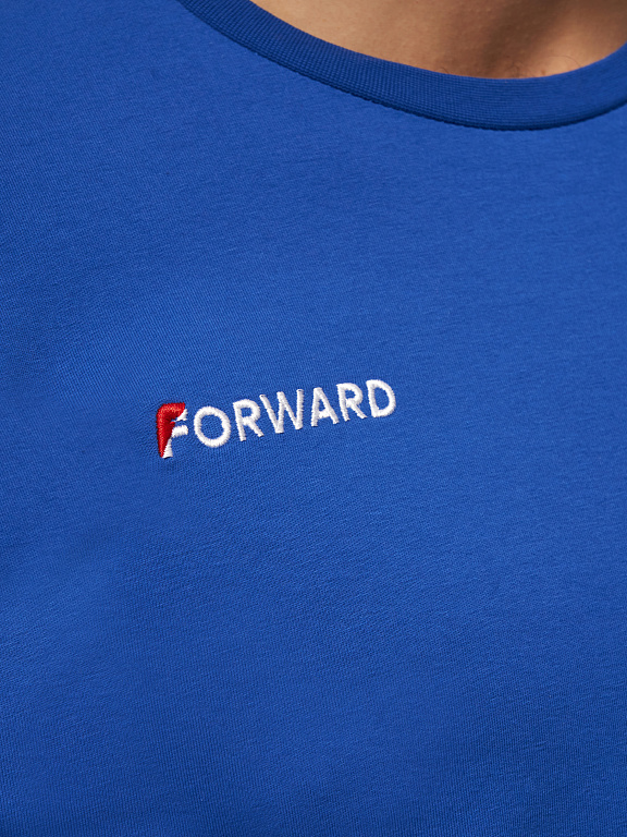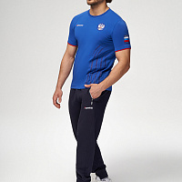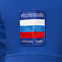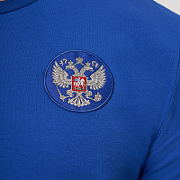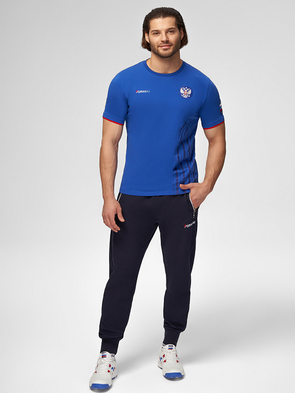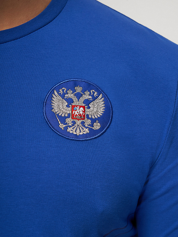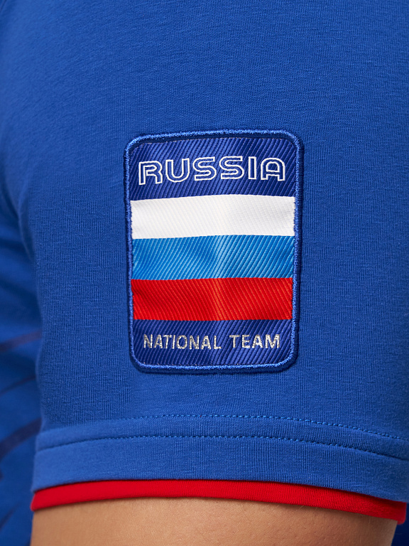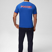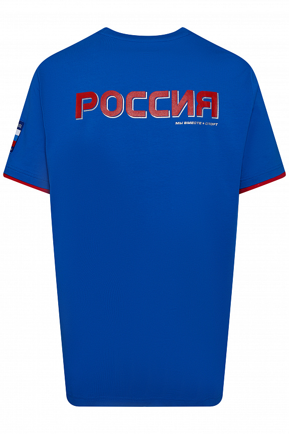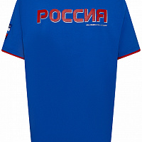 Футболка прямого силуэта с О-образным вырезом горловины. Обтачка горловины выполнена комбинированная из трикотажного полотна ластик . Рукав покроя реглан с принтованной вставкой по центру. Спинка выполнена из полотна компаньона - ложная сетка. Нанесения: Жаккардовый шеврон «Герб РФ», жаккардовый шеврон «Флаг РФ», принт «РОССИЯ Мы вместе. Спорт», вышивка «FORWARD», 3D вышивка «F», принт «Трек». Состав: 100% полиэстер 145gr/m², полотно компаньон ложная сетка 100% полиэстер 145gr/m².