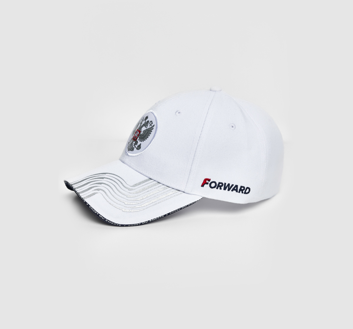 Бейсболка с жёстким козырьком. Для удобства в бейсболке предусмотрена застёжка с хлястиком и металлической пряжкой. Изготовлена из шести клиньев. Козырек выполнен с кантом. Нанесения: вышивка «FORWARD», жаккардовый шеврон «Герб РФ», принт на козырьке. Состав: 100% акрил.