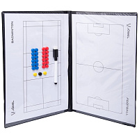 Универсальный планшет тренера в фирменной папке Jögel – важный тактический аксессуар. Магнитная тренерская доска имеет специальное покрытие, позволяющее стирать надписи. В комплект входят карточки с разметкой поля для 10 видов спорта, маркер с ластиком и пустой бланк для записей. 27 фишек на магнитах выполнены в 4 разных цветах и упрощают использование планшета навесу или в поездке. Удобный чехол на молнии входит в комплект и обеспечивает сохранность всех составляющих набора. Преимущества: Удобный формат (в сложенном виде - А4); Защитная папка для хранения; Карточки с разметкой поля для 10 видов спорта; Фишки 4 цветов; Бланк для записей; Маркер с ластиком; Практичный чехол на молнии в комплекте. Характеристики: Материал: поливинилхлорид Комплектация: планшет, 10 карточек, маркер, ластик, фишки (12 синих, 12 красных, 2 желтые, 1 черная), бланк для записей, папка Цвет: черный/белый Габариты, см: 26 х 2 х 36 Вес,г: 665