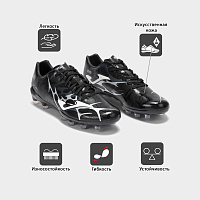 бутсы для игры на натуральном газоне. Верхняя часть выполнена из цельного куска прочного синтетического материала, обеспечивающего хороший контакт с мячом. Бесшовная технология помогает снизить вес модели. В области голеностопа имеется текстильная вставка (носочная система), образующая единую деталь с язычком, которая улучшает посадку стопы, фиксируя ее положение. Форма и расположение шипов обеспечивают хорошее сцепление с поверхностью и устойчивость при беге и резких сменах направления движения.
