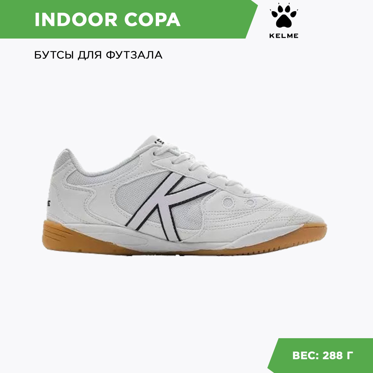 Футзалки Indoor Copa, базовая модель KELME, легкие и гибкие. Верхняя часть выполнена из искусственной замши и вставок из сетчатого текстиля, хорошо пропускающего воздух. Подошва среднего профиля из резины не оставляющей следов на паркете и обеспечивающей хорошее сцепление с игровой поверхностью. Пятка усилена для защиты, носок прошит.