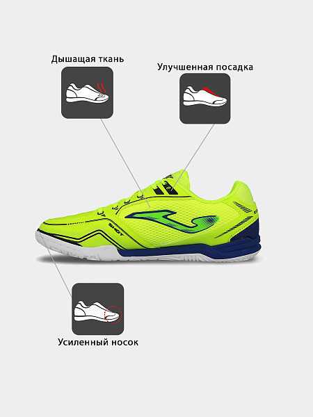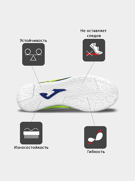 Joma Dribling, футзалки, верх которых изготовлен из прочного и гибкого синтетического материала Fibertec (искусственная кожа). Боковые части выполнены из сетчатого текстиля, отвечающего за доступ воздуха. Мягкий текстильный материал применен во внутренней части верха. В области носка в материале также имеются вентиляционные отверстия (система VTS), благодаря которым стопа игрока все время матча или тренировки остается сухой. Усиленная пятка и носок защищают от повреждений. Дополнительный защитный элемент в носочной области помогает наносить сильные удары по мячу. Подошва DRIBLING выполнена из износостойкой резины (технология DURABILITY) , обеспечивающей отличный контракт с игровой поверхностью. Точка разворота ROTATION помогает легко и без риска травмы изменять направление движения на паркете. Линии FLEXO делают футзалки гибкими и способствуют естественному движению стопы по время бега. Технология PERFECT FIT, используемая в зоне шнуровки, обеспечивает оптимальную посадку кроссовок.