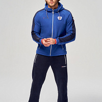 Куртка прямого силуэта с капюшоном. Полочка с центральной застежкой на тесьму молнию. Боковые карманы прорезные обработаны с тесьмой молнией. Капюшон регулируется по высоте с помощью шнурка. Рукава покроя реглан.На рукавах декоративные вставки из ламинированного флиса. Манжеты выполнены из трикотажного полотна ластик. Низ изделия регулируется при помощи эластичного шнура и фиксаторов. Нанесения на куртке: Жаккардовый шеврон «Герб РФ», жаккардовый шеврон«Флаг РФ+RUSSIAN NATIONAL TEAM», вышивка «FORWARD», вышивка «RUSSIA», принт «WINNER». Брюки слегка зауженного к низу силуэта. Боковые карманы прорезные, застегиваются на молнию. Вдоль боковых швов декоративныевставки из ламинированного флиса. Пояс с эластичной тесьмой. Ширина пояса регулируется шнуром, вставленным внутрь. Ширина по низу регулируется при помощи эластичного шнура и фиксаторов. Нанесения на брюках: вышивка «FORWARD», вышивка «RUS». Состав: ткань верха 100% полиэстер 240г/м², флис с двусторонним подчесом.