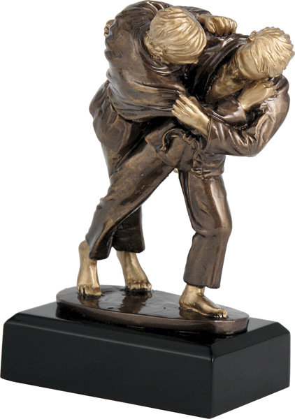 Фигурка литая "Дзюдо". Цвет бронза. Высота 18,5 см. Изображены два спортсмена в схватке, один из них выполняет бросок "задняя подножка". Фигурка установлена на цоколе черного цвета в форме прямоугольника.