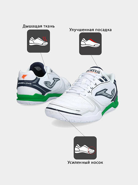 Joma Dribling, футзалки, верх которых изготовлен из прочного и гибкого синтетического материала Fibertec (искусственная кожа). Боковые части выполнены из сетчатого текстиля, отвечающего за доступ воздуха. Мягкий текстильный материал применен во внутренней части верха. В области носка в материале также имеются вентиляционные отверстия (система VTS), благодаря которым стопа игрока все время матча или тренировки остается сухой. Усиленная пятка и носок защищают от повреждений. Дополнительный защитный элемент в носочной области помогает наносить сильные удары по мячу. Подошва DRIBLING выполнена из износостойкой резины (технология DURABILITY) , обеспечивающей отличный контракт с игровой поверхностью. Точка разворота ROTATION помогает легко и без риска травмы изменять направление движения на паркете. Линии FLEXO делают футзалки гибкими и способствуют естественному движению стопы по время бега. Технология PERFECT FIT, используемая в зоне шнуровки, обеспечивает оптимальную посадку кроссовок.