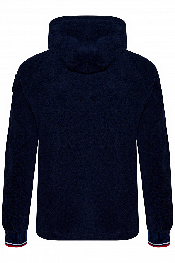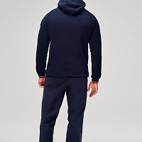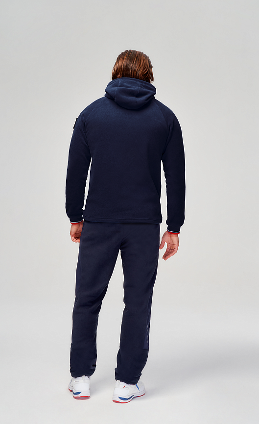 Куртка прямого силуэта с капюшоном. Полочка с центральной застежкой на тесьму молнию. Боковые карманы прорезные обработаны с тесьмой молнией. Капюшон регулируется по высоте с помощью шнурка. Рукава покроя реглан.На рукавах декоративные вставки из ламинированного флиса. Манжеты выполнены из трикотажного полотна ластик. Низ изделия регулируется при помощи эластичного шнура и фиксаторов. Нанесения на куртке: Жаккардовый шеврон «Герб РФ», жаккардовый шеврон«Флаг РФ+RUSSIAN NATIONAL TEAM», вышивка «FORWARD», вышивка «RUSSIA», принт «WINNER». Брюки слегка зауженного к низу силуэта. Боковые карманы прорезные, застегиваются на молнию. Вдоль боковых швов декоративныевставки из ламинированного флиса. Пояс с эластичной тесьмой. Ширина пояса регулируется шнуром, вставленным внутрь. Ширина по низу регулируется при помощи эластичного шнура и фиксаторов. Нанесения на брюках: вышивка «FORWARD», вышивка «RUS». Состав: ткань верха 100% полиэстер 240г/м², флис с двусторонним подчесом.