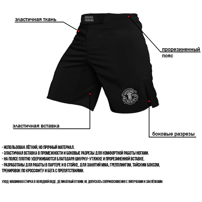 Шорты Hardcore Training Black Shadow 2.0. Лучшее соотношение цена/качество. Строгий и лаконичный дизайн. Использован лёгкий, но прочный материал. Присутствует эластичная вставка в промежности, а так же боковые разрезы. Эти факторы дают при работе в шортах ощущение полной свободы. На поясе плотно удерживаются благодаря шнурку-утяжке и прорезиненной вставке. Разработаны для работы в партере и в стойке, для занятий мма, грепплингом, тайским боксом, тренировок по кроссфиту и бега с препятствиями. Состав: полиэстер, лайкра. Уход: машинная стирка в холодной воде, деликатный отжим, не допускать соприкосновения с липучками и заклепками.