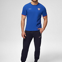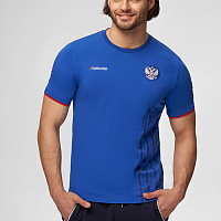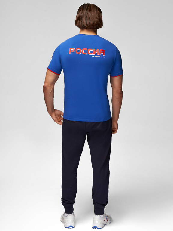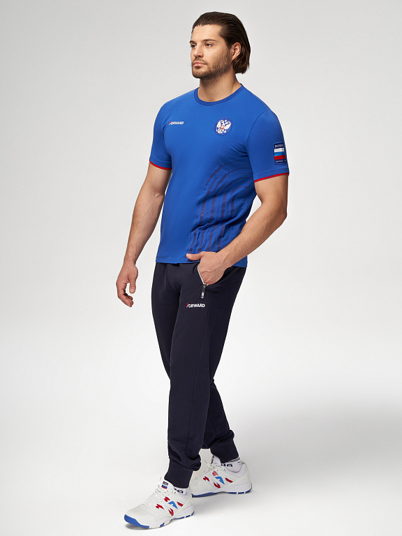 Футболка прямого силуэта с О-образным вырезом горловины. Обтачка горловины выполнена комбинированная из трикотажного полотна ластик . Рукав покроя реглан с принтованной вставкой по центру. Спинка выполнена из полотна компаньона - ложная сетка. Нанесения: Жаккардовый шеврон «Герб РФ», жаккардовый шеврон «Флаг РФ», принт «РОССИЯ Мы вместе. Спорт», вышивка «FORWARD», 3D вышивка «F», принт «Трек». Состав: 100% полиэстер 145gr/m², полотно компаньон ложная сетка 100% полиэстер 145gr/m².