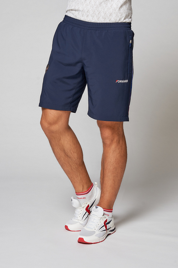 Шорты прямого силуэта без застежки, на подкладке из сетчатого трикотажного полотна. Пояс с эластичной тесьмой. Ширина пояса регулируется шнуром, вложенным внутрь. По боковым швам вставки из запринтованной ткани. На задних половиках шорт кокетка из трикотажного сетчатого материала. Так же сетчатые вставки выполнены по шаговым швам. Боковые карманы с тесьмой молнией. Нанесения: Жаккардовый шеврон «Герб РФ», аппликативная вышивка «RUS», вышивка «FORWARD», декоративный принт. Состав: ткань верха 100% полиэстер, 90-95г/м2, ткань отделки 100% полиэстер, сетка, 135г/м2, подкладка 100% полиэстер, сетка, 80г/м2.