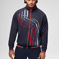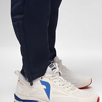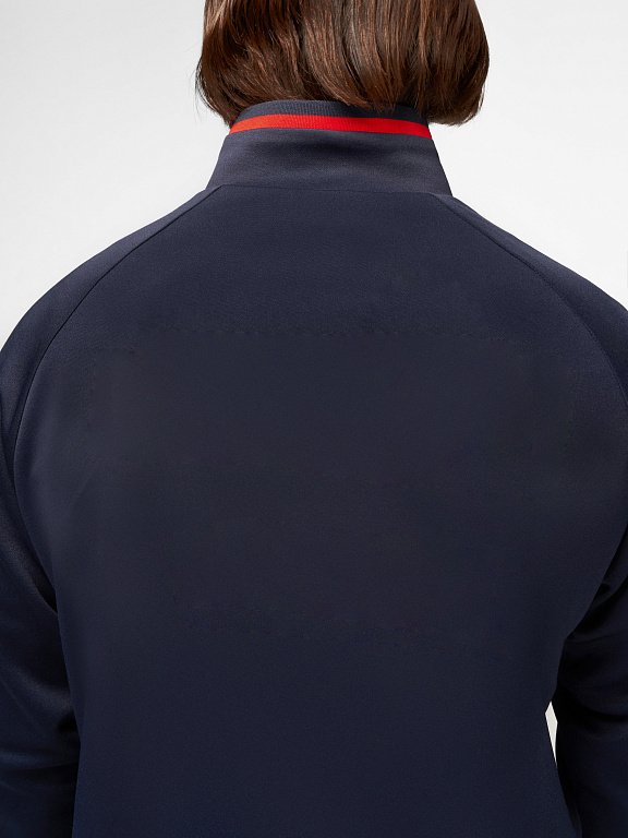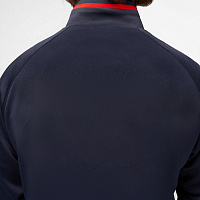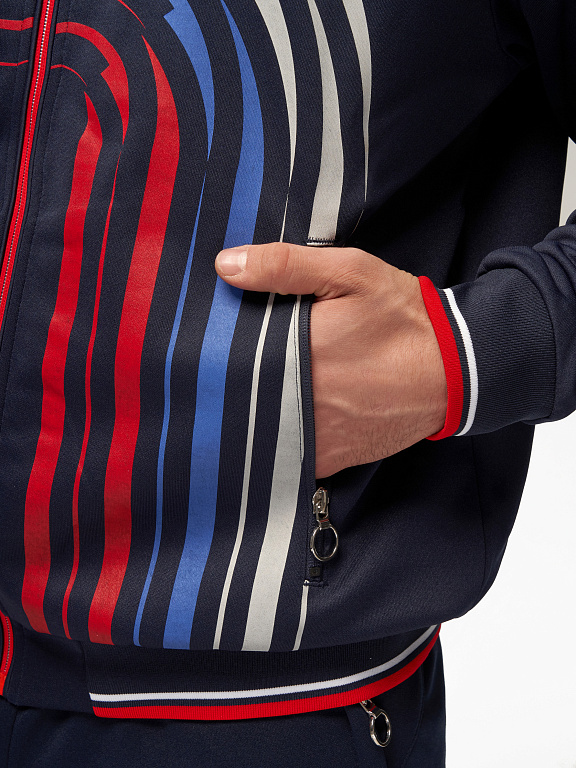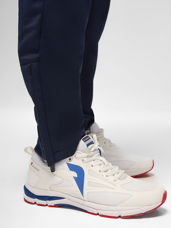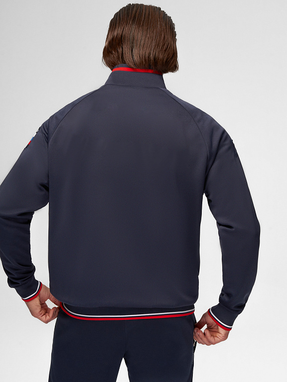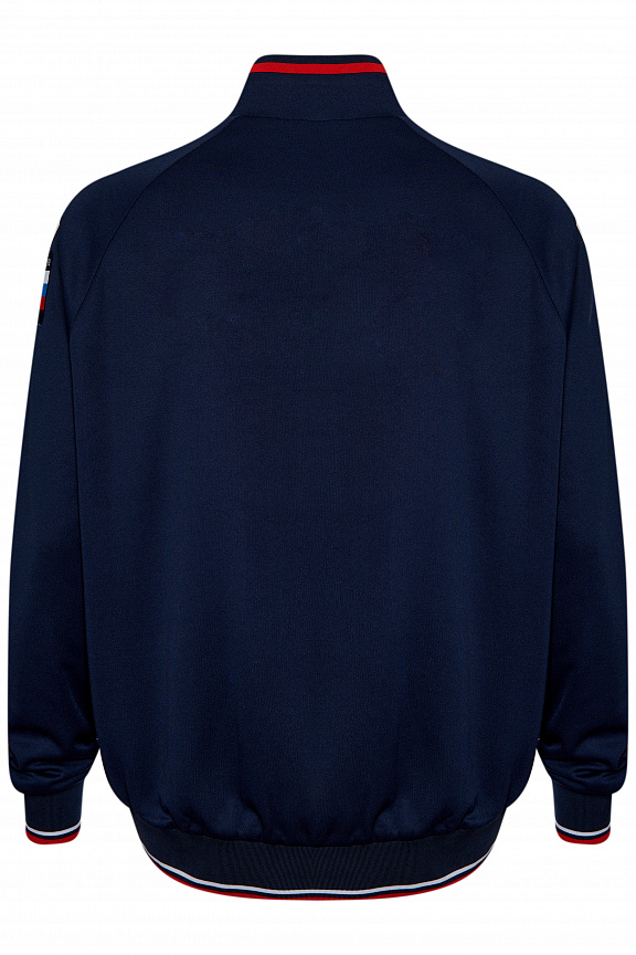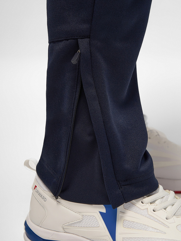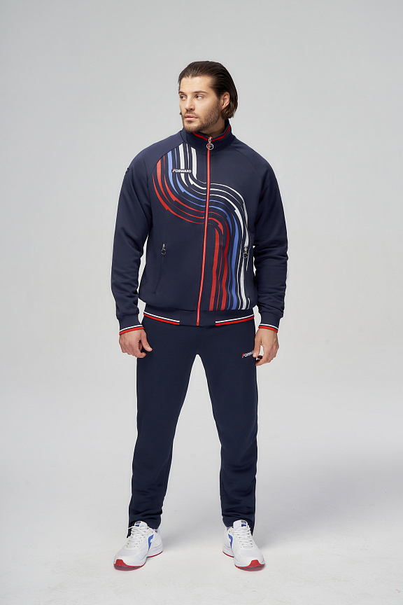 Куртка прямого силуэта на подкладке из сетки. Воротник стойка, внутреняя сторона из трикотажного полотна ластик. Полочка с центральной застежкой молнией. На полочках прорезные боковые карманы на молнии. Рукава покроя Реглан с отрезными манжетами из трикотажного полотна ластик. Низ изделия с поясом из трикотажного полотна ластик. Нанесения на куртке: Жаккардовый шеврон «Герб РФ», жаккардовый шеврон «Флаг РФ», принт «РОССИЯ, Мы Вместе. Спорт», принт «FORWARD», декоративный принт «Трек». Брюки слегка заужены. Боковые карманы в контсруктиных швах на тесьме молнии. Вдоль боковых швов декоративный принт. Пояс с эластичной тесьмой. Ширина пояса регулируется шнуром, вложенным внутрь. В боковых швах, по низу брюк выполнены разрезы с тесьмой молнией. Нанесения брюки: вышивка «FORWARD». Состав: ткань верха 100% полиэстер 250г/м², подкладка сетка: 100% полиэстер.