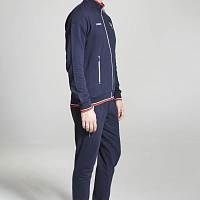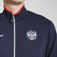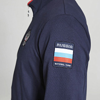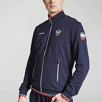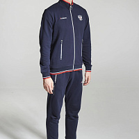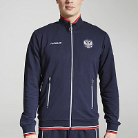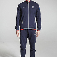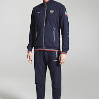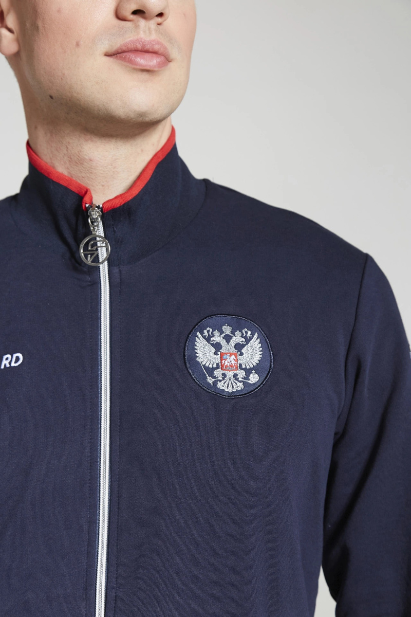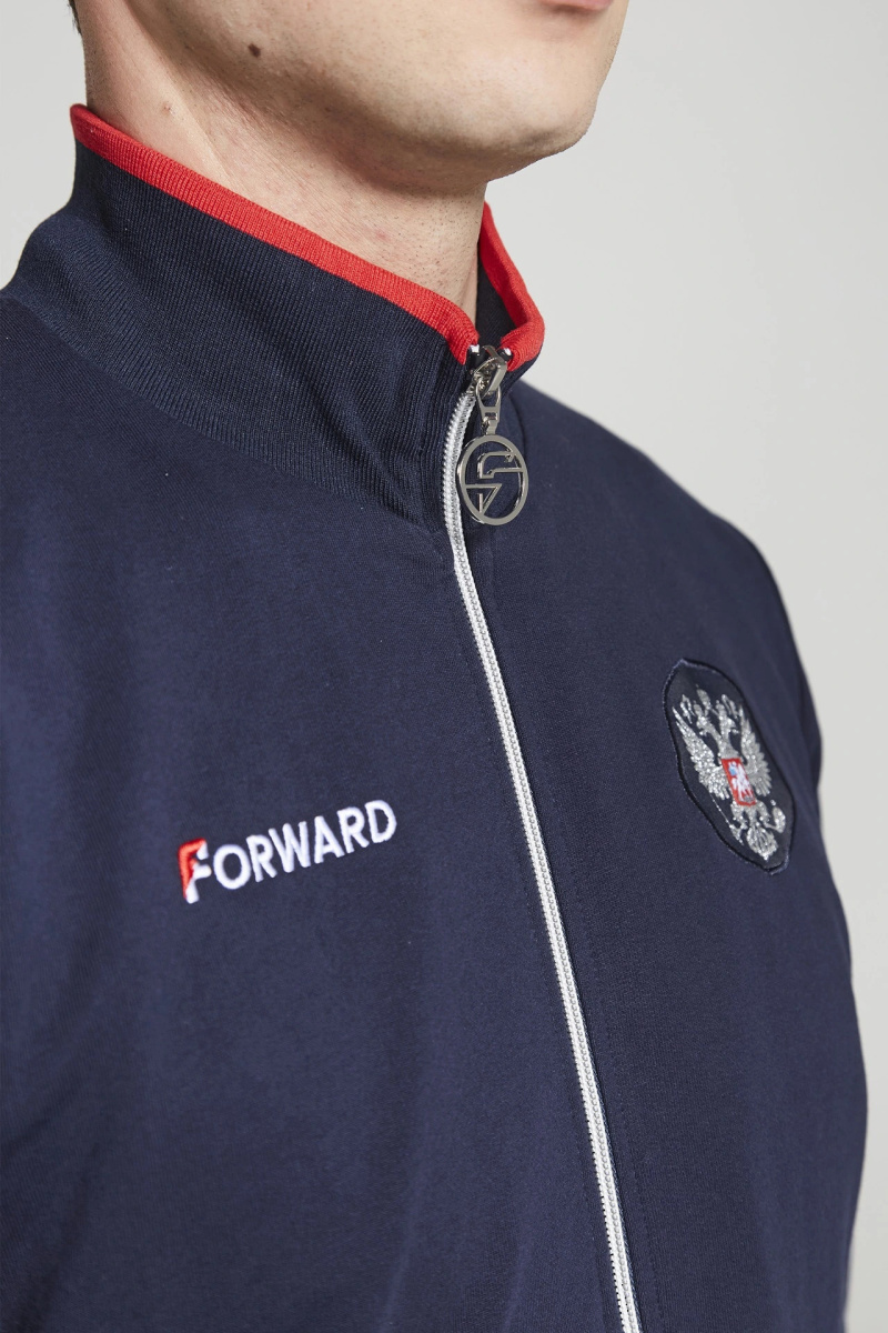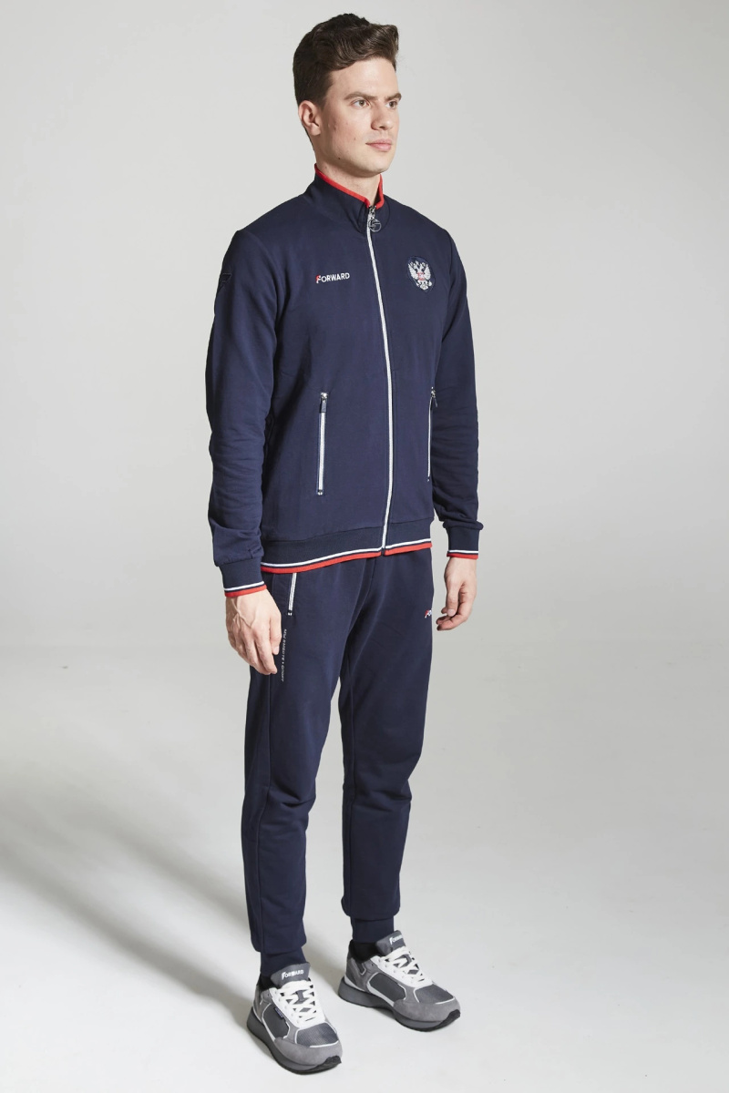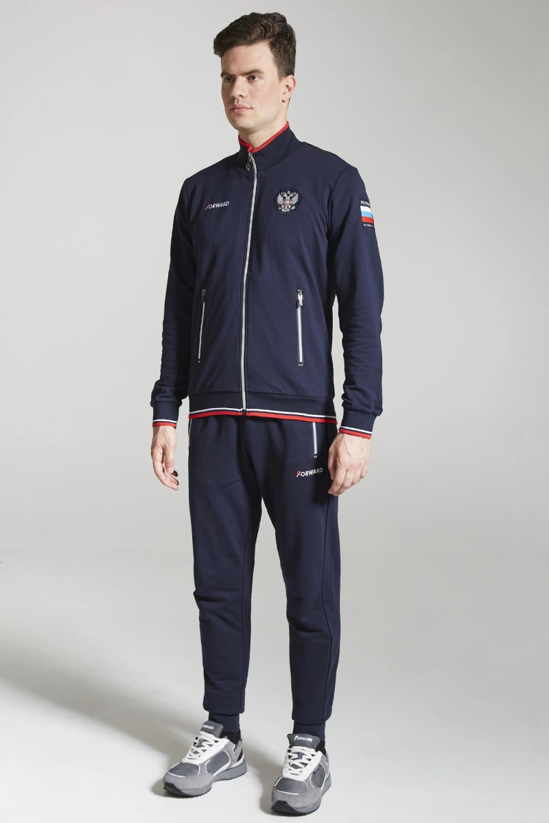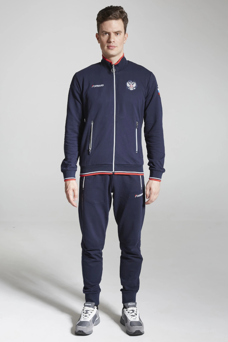 Куртка прямого силуэта. Полочка с центральной застежкой на тесьму молнию, с воротником стойка. Боковые крманы прорезные с входами на тесьме молнии. Рукава втачные. Воротник манжеты рукавов и низ изделия обработаны с трикотажным полотном ластик. Нанесения на куртке: Жаккардовый шеврон «Герб РФ», жаккардовый шеврон «Флаг РФ», вышивка «FORWARD», декоративный принт «Трек», принт «Мы вместе.Спорт». Брюки зауженного силуэта с боковыми, прорезными карманами на тесьму молнию. Пояс с эластичной тесьмой. Ширина пояса регулируется шнуром, вставленным внутрь. Низ брюк выполнен с манжетами из трикотажного полотна ластик. Нанесения брюки: вышивка «FORWARD», вышивка «Мы вместе.Спорт». Состав: 80% хлопок, 20% полиэстер, 290г/м?.